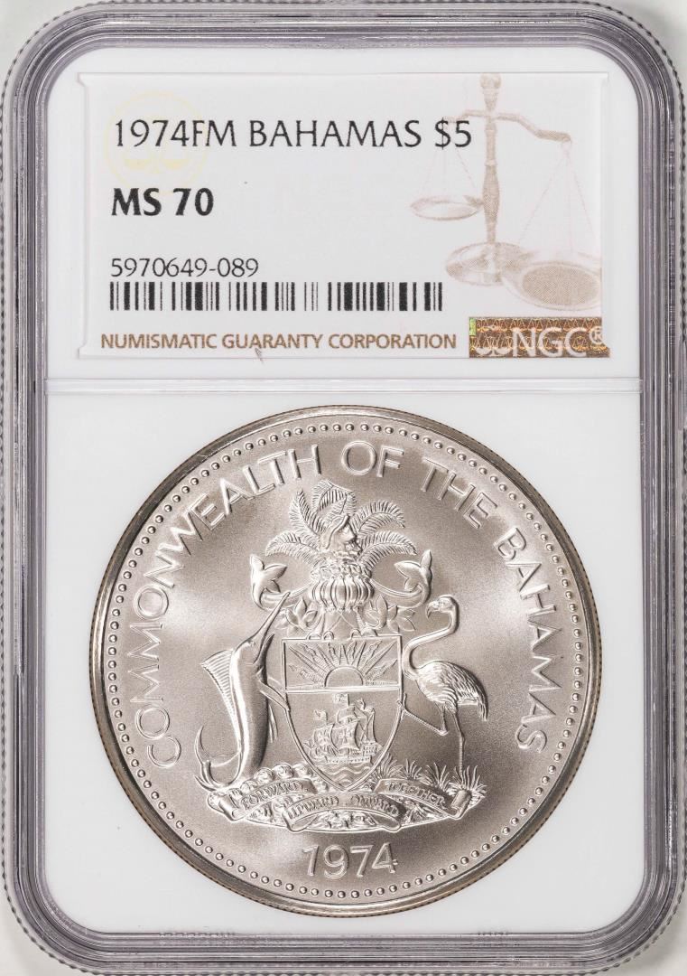 One 1974FM $5 Bahamas Commonwealth Coin NGC MS70. NGC Certified.