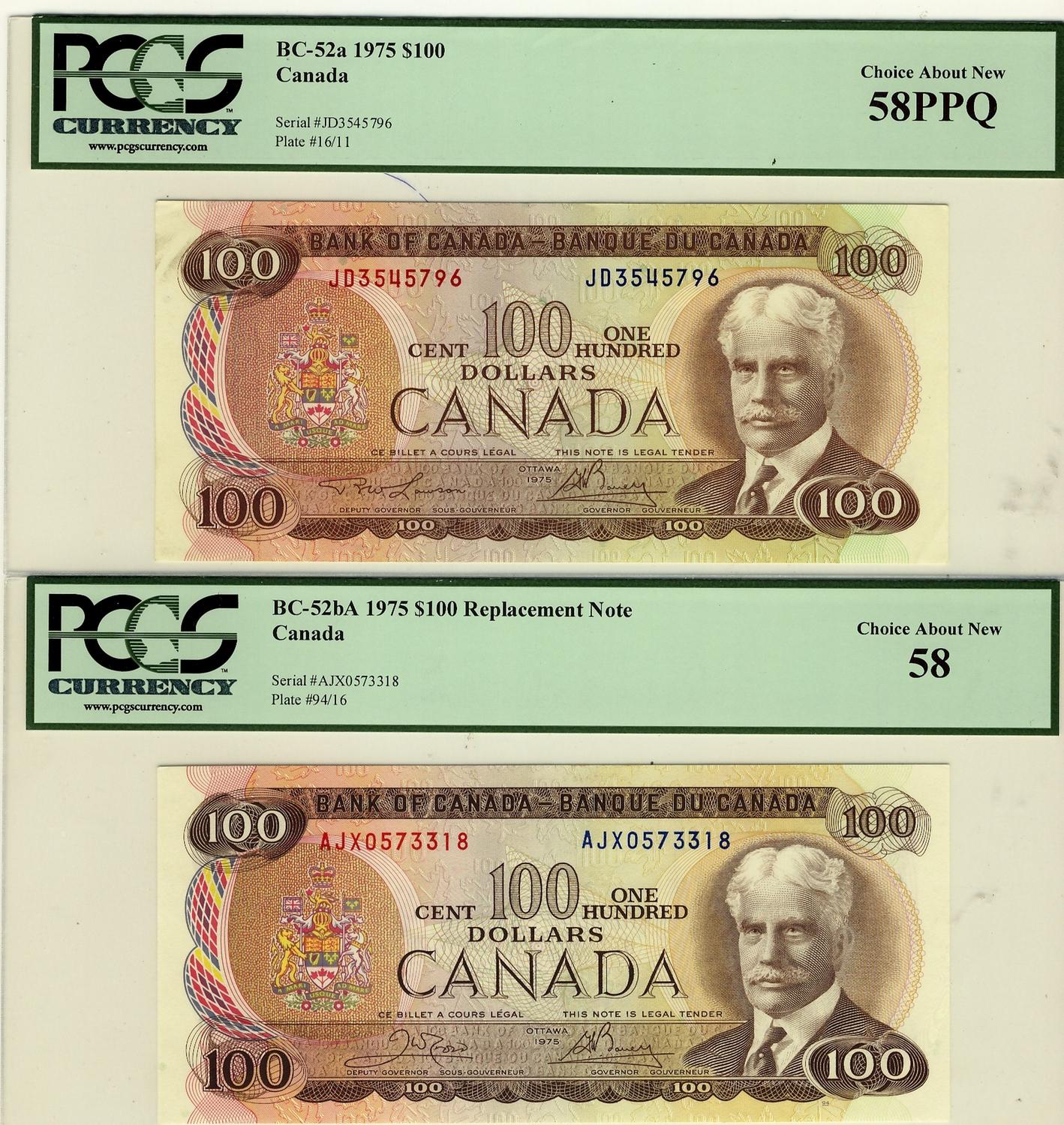 1975 $100 BC-52a PCGS AU58. Lot of 2 notes one with PPQ designation.