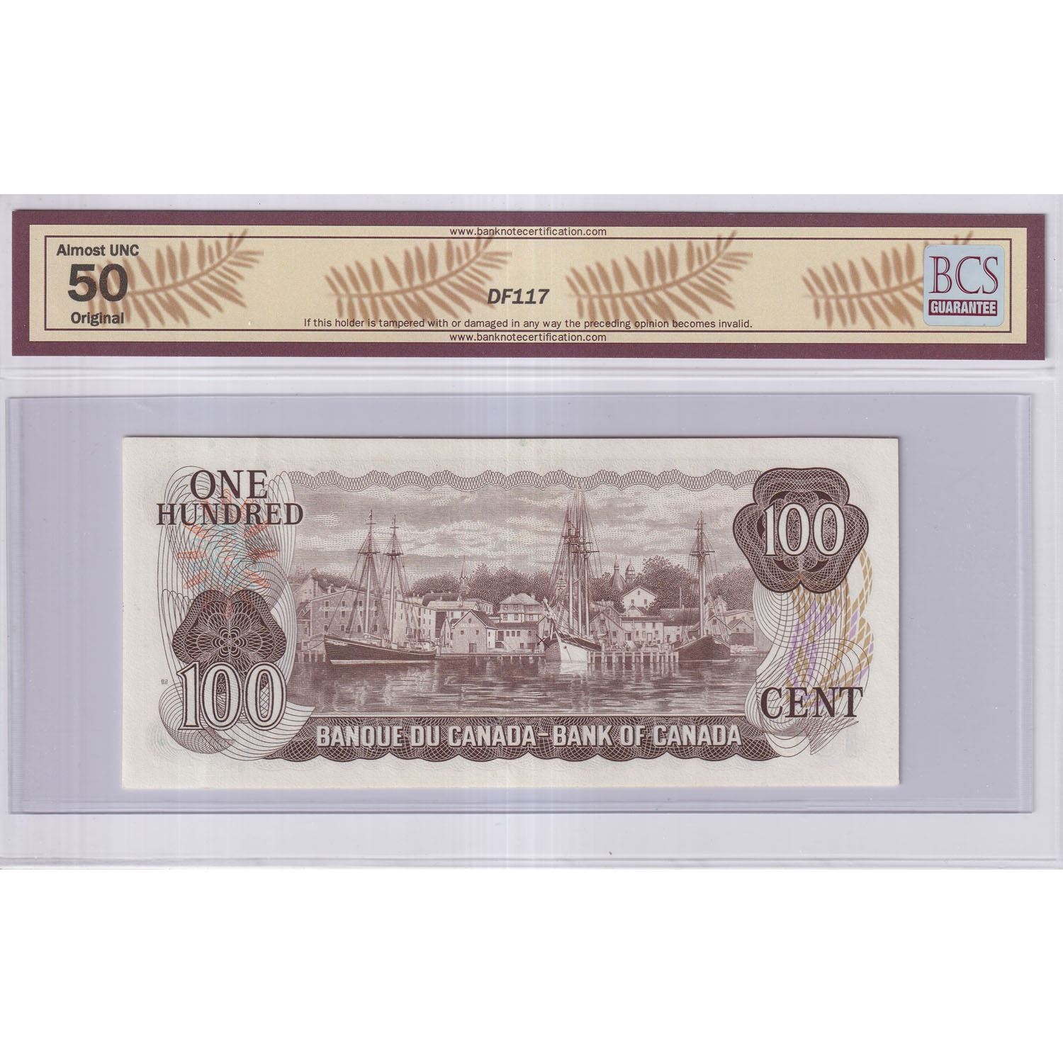 1975 $100 BC-52b-N1-iii, Bank of Canada, Crow-Bouey, 4 Digit RADAR Serial Number AJH7458547, BCS Certified AU-50 Original.