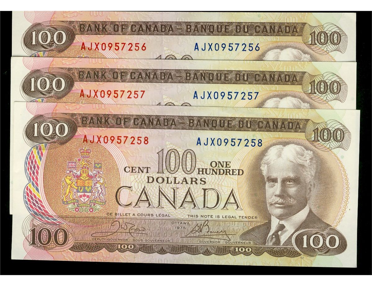 1975 $100 BC-52bA #AJX0957256-258. Lot of 3 consecutive AU issues with light middle bend.