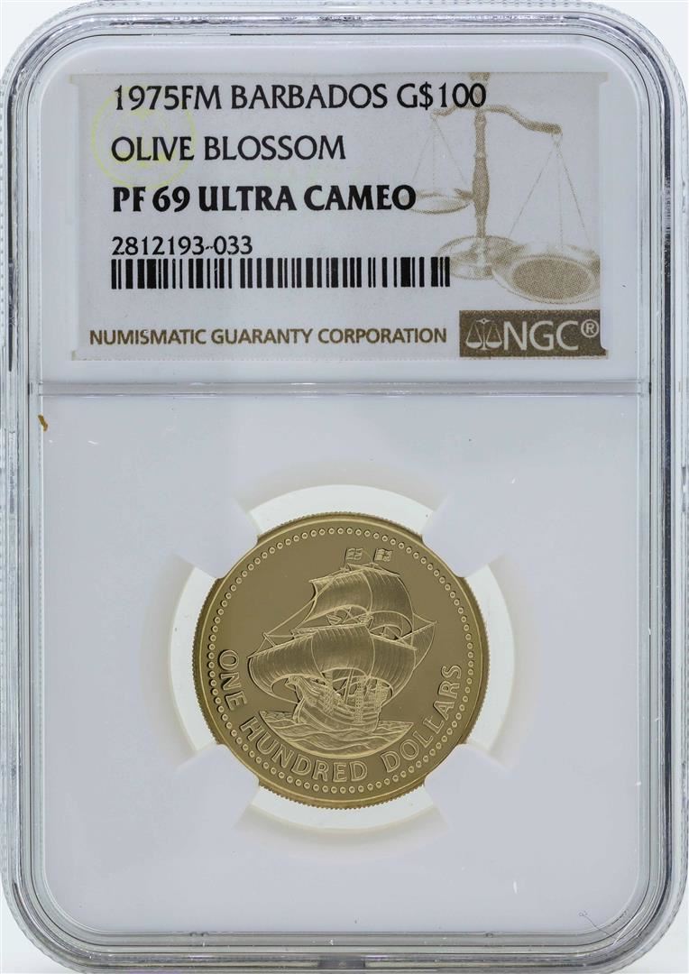 One 1975 $100 Barbados Olive Blossom Gold Coin NGC PF69 Ultra Cameo. NGC Certified.