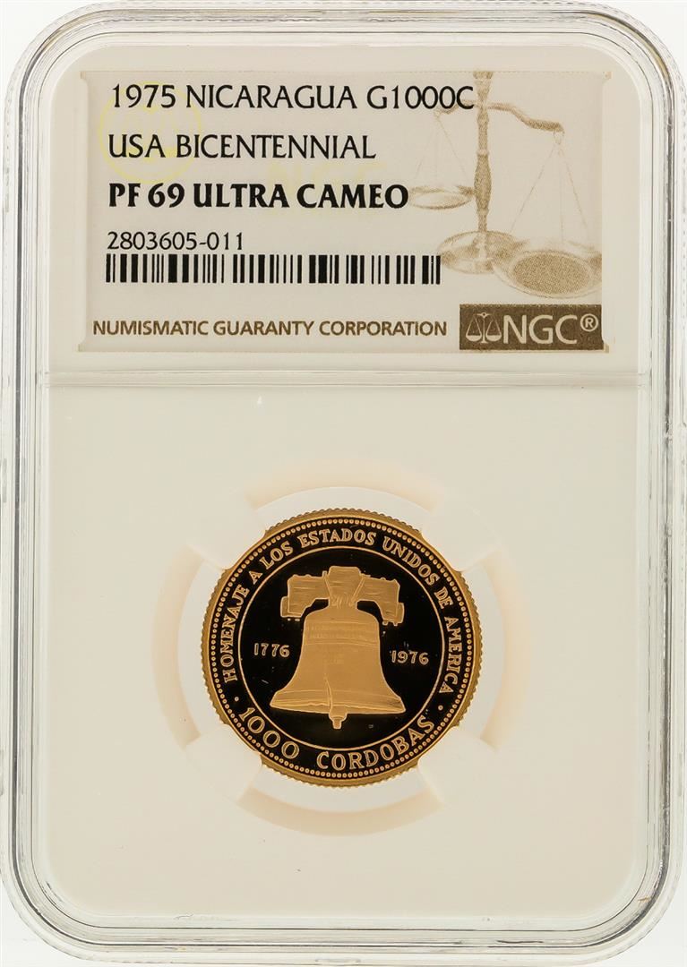1975 1000C Nicaragua USA Bicentennial Gold Coin NGC Graded MS69 Ultra Cameo