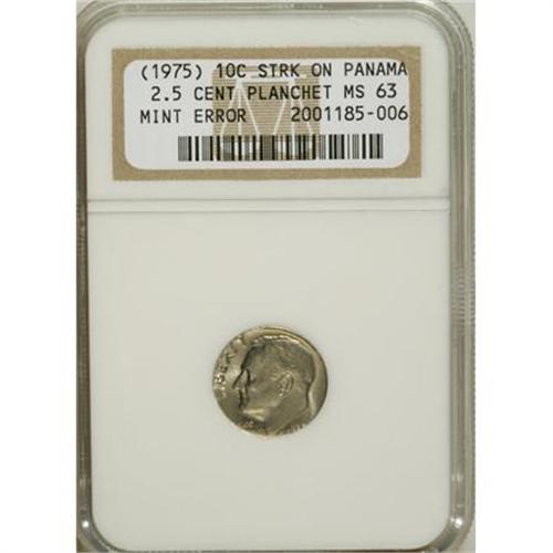 <B>1975 10C Roosevelt Dime--Struck on a Panama 2 1/2 Centesimo Planchet--MS63 NGC.</B></I> Though the last two digits of the date are cut off, enough remains to identify the coin. Strongly lustrous and well struck overall with attractively preserved surfaces.<BR><BR><B>Coin Engraver:</B> John R. Sinnock<BR><BR><b>Shipping:</b> Coins & Currency (<a target="_blank" href="http://www.heritageauctions.com/common/shipping.php">view shipping information</a>)