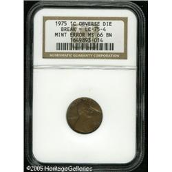 <B>1975 1C Cent--Obverse Die Break--MS66 Brown NGC.</B></I> LC-75-4. A large, blob-like die cud is positioned between 1 and 3 o'clock on the obverse. Glossy brown and blue patina is seen over both sides. Lot:10870