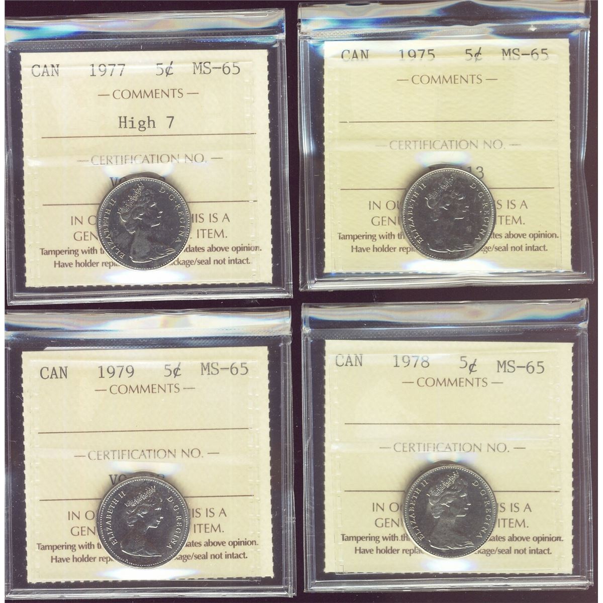 1975 5¢, 1977 High, 1978 & 1979 ICCS MS65. Lot of 4 coins.