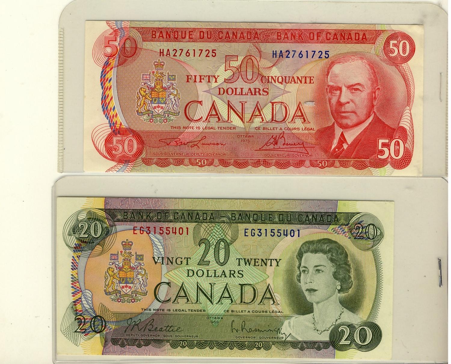 1975 $50 BC-51a #HA2761725 & 1969 $20 BC-50a #EG3155401. Lot of 2 notes AU-UNC.