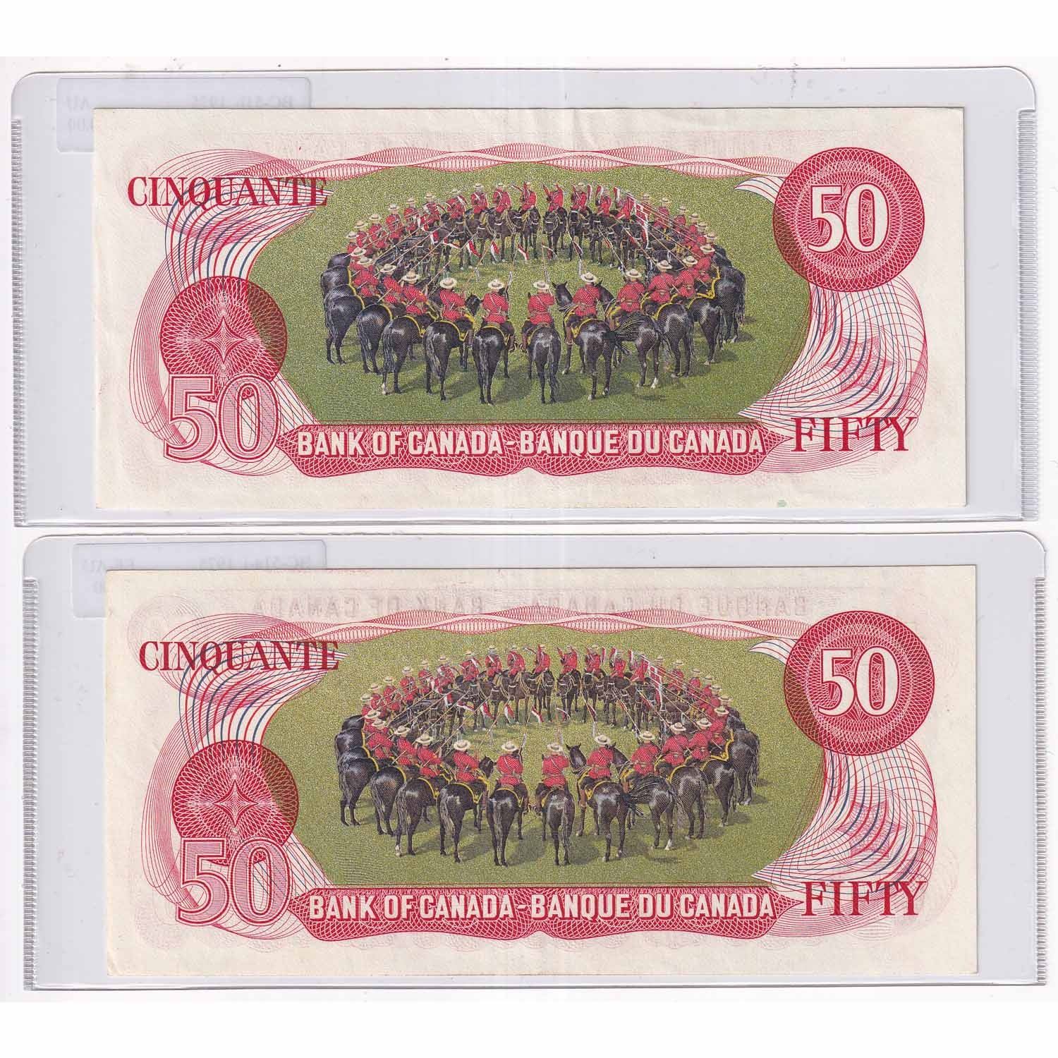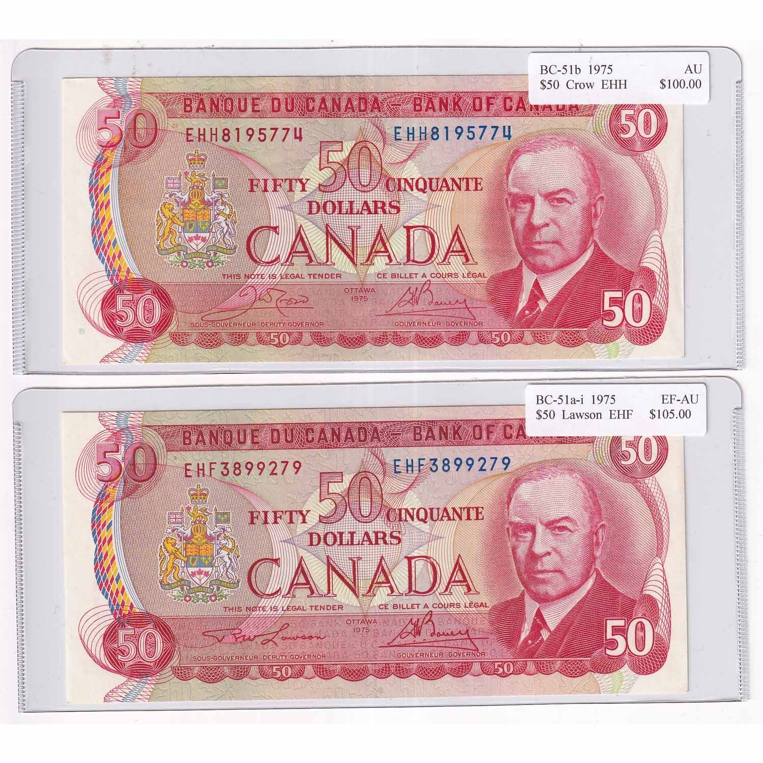 1975 $50 BC-51a-I, Bank of Canada, Lawson-Bouey, EHF Prefix EF-AU & 1973 $50 BC-51b, Crow-Bouey, EHH Prefix AU. 2pcs