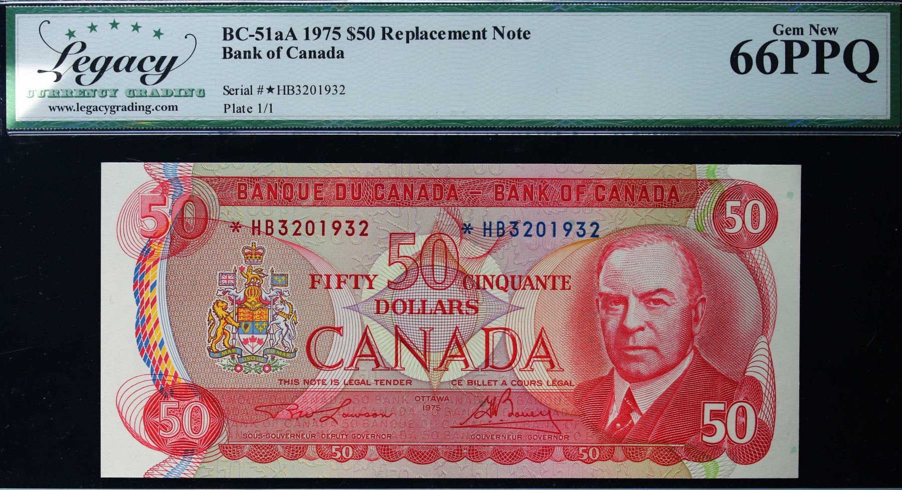 1975 $50 BC-51aA #*HB3201932 LCG Superb Gem Uncirculated-66PPQ. This is a pristine issue with great eye appeal, good margins and superb embossing.