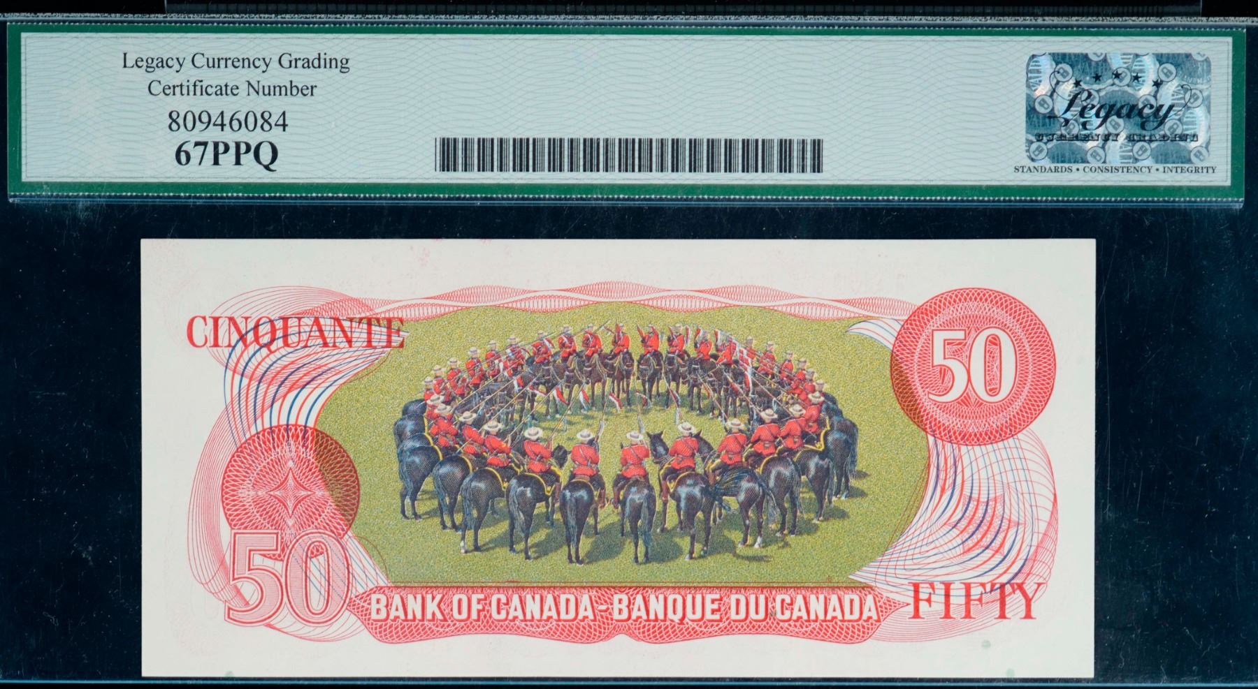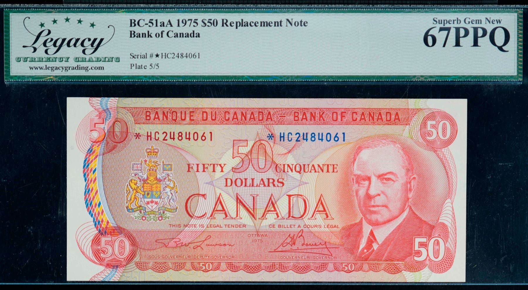 1975 $50 BC-51aA #*HC2484061, Legacy Superb Gem Uncirculated-67PPQ. This is a pristine issue with great eye appeal, good margins and superb embossing.