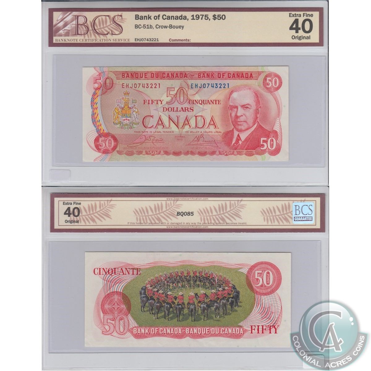 1975 $50 BC-51b Bank of Canada Crow-Bouey Note EHJ Prefix BCS Certified EF-40