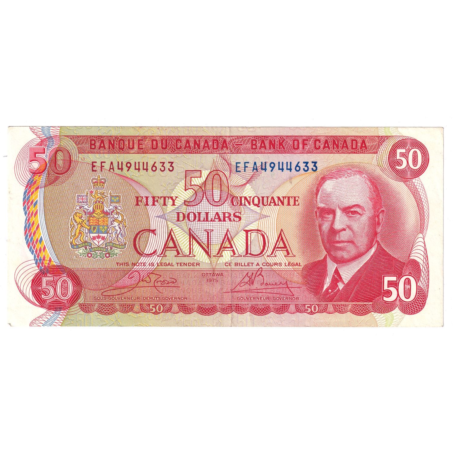 1975 $50 BC-51b Bank of Canada Note, Crow-Bouey, EFA4944633, VF-EF (2 small holes to the left around the Coat of Arms).