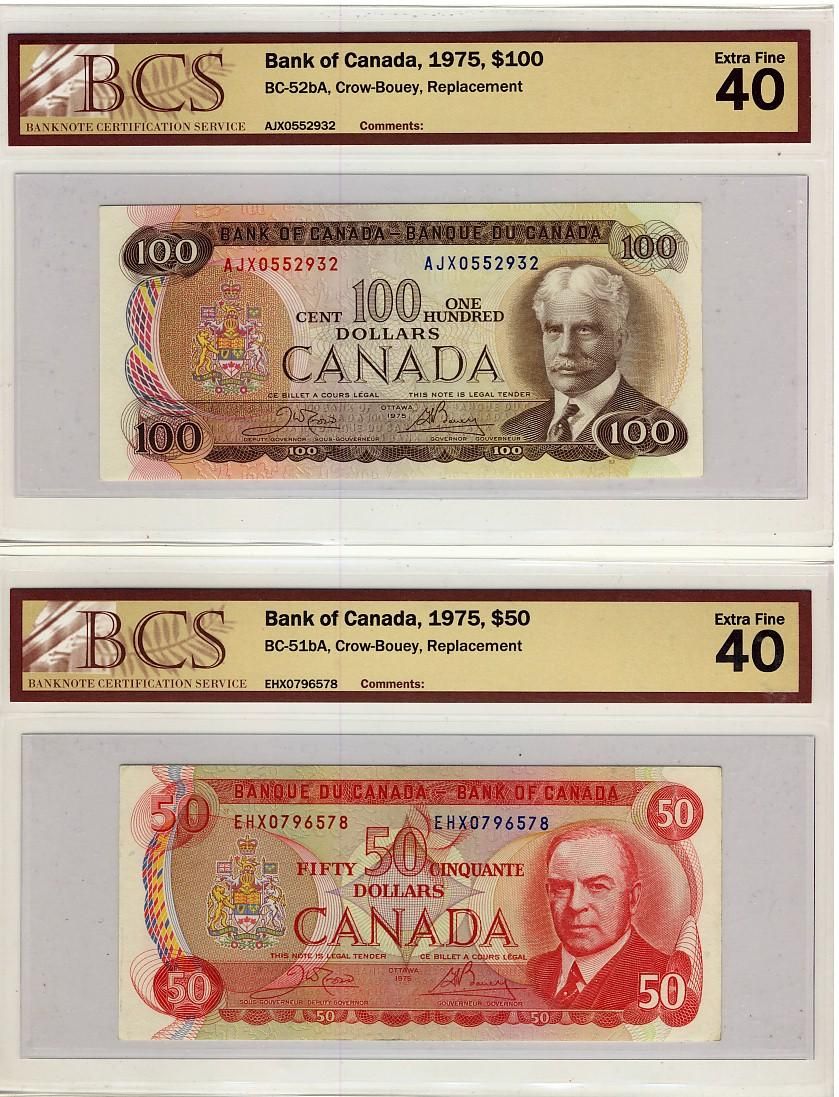 1975 $50 BC-51bA EHX0796578 and 1975 $100 BC-52bA AJX0552932 Lot of two notes All BCS EF40