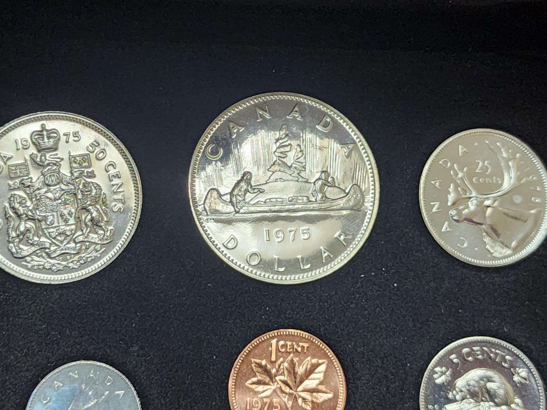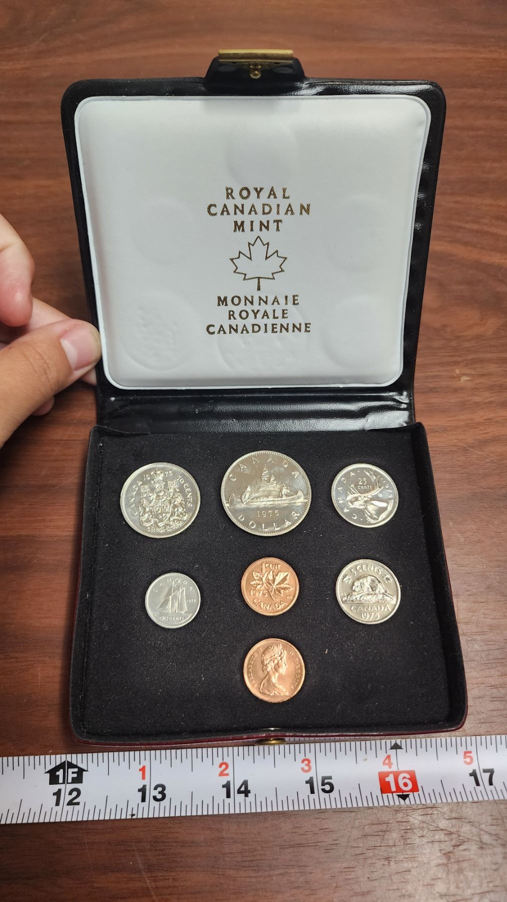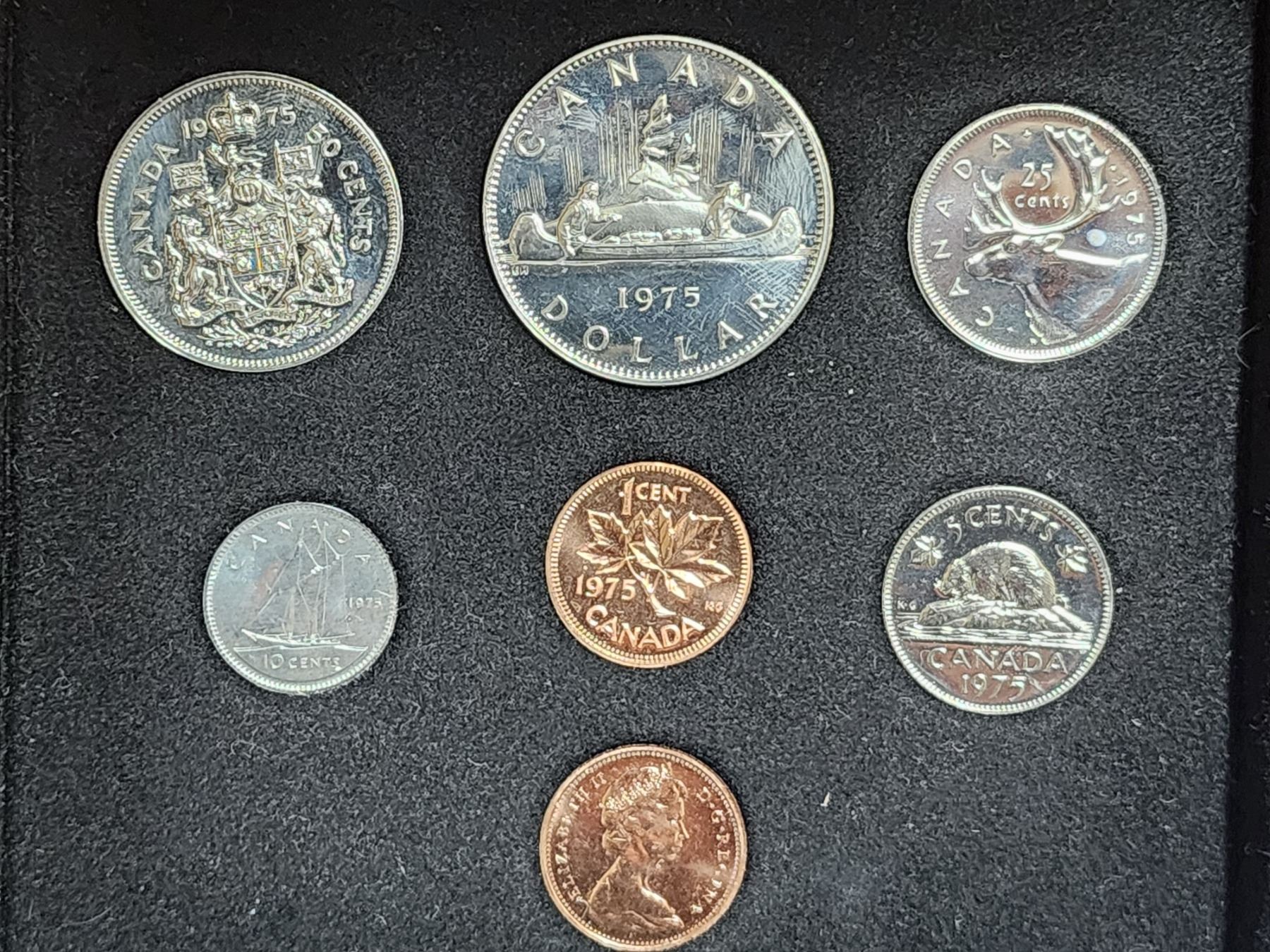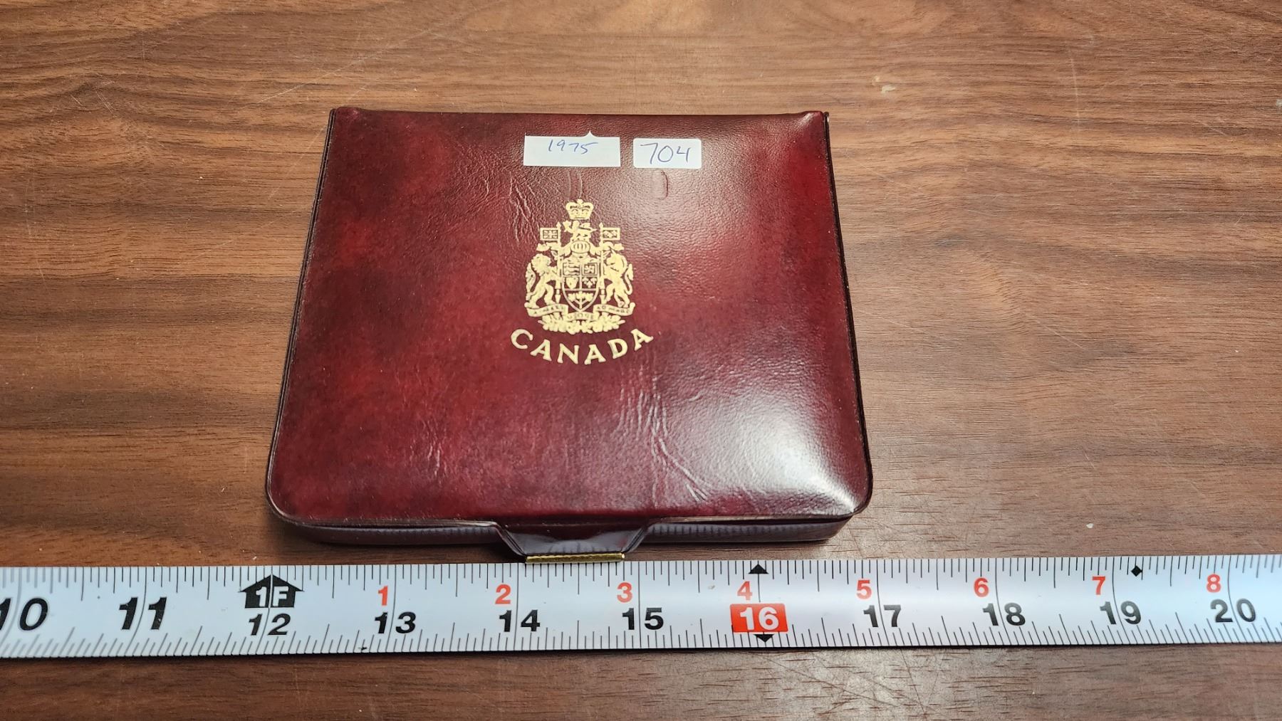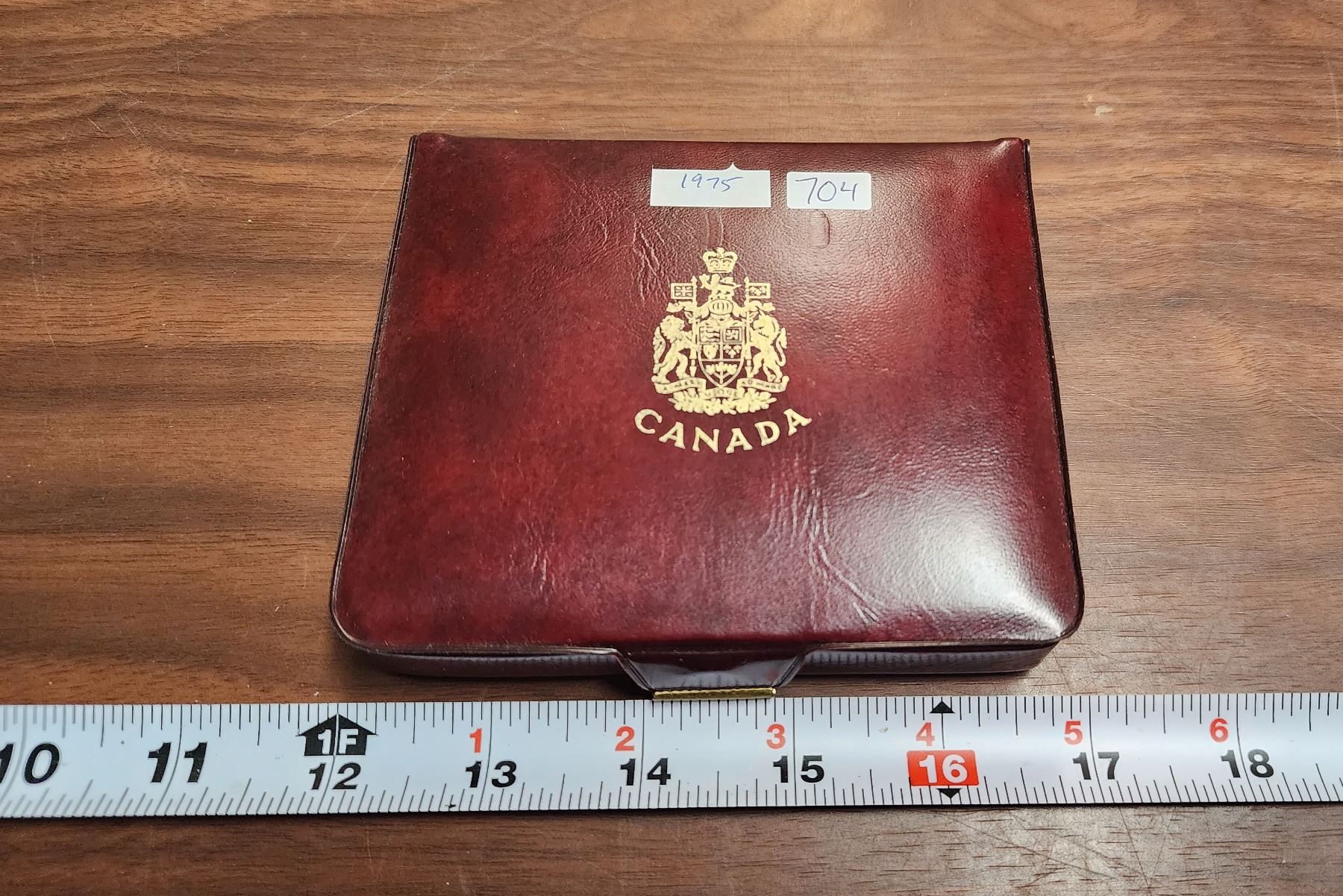 1975 7-coin Nickel Custom Set. Includes 2 Small Cents. Housed in its original RCM maroon case with Canada’s Coat of Arms & CANADA stamped in gold.