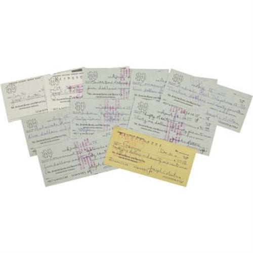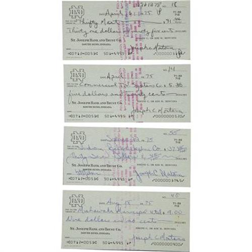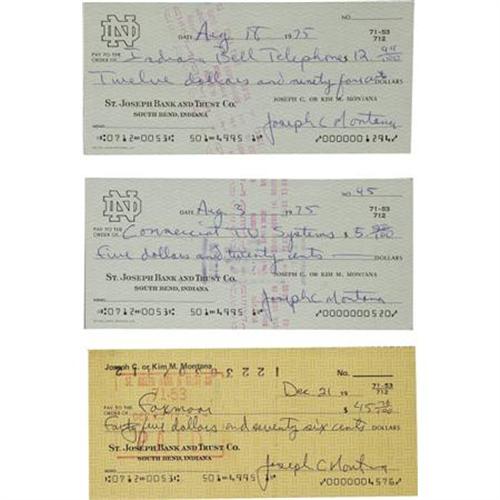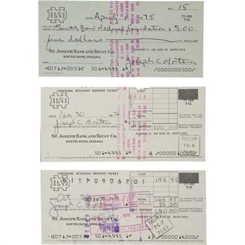 <B>1975-76 Joe Montana Signed Checks/Deposit Slips Lot of 10.</B></I> Eight checks drawn on Joe and Kim Montana's Notre Dame bank account make payments to Thrifty Mart, the telephone company and the South Bend Medical Foundation. Each is filled out entirely in the superstar quarterback's hand, and signed "Joseph C. Montana" at the close. Two deposit slips for the same encount are similarly signed. All are in flawless condition, with no folds, tears or other condition problems. One of several lots of checks offered within this auction. We are aware of no other Montana checks ever having surfaced in the hobby prior to this grouping. <I>LOA from PSA/DNA. LOA from James Spence Authentication.</B></I><BR><BR><b>Shipping:</b> Miscellaneous Collectibles, Smal (<a target="_blank" href="http://www.heritageauctions.com/common/shipping.php">view shipping information</a>)