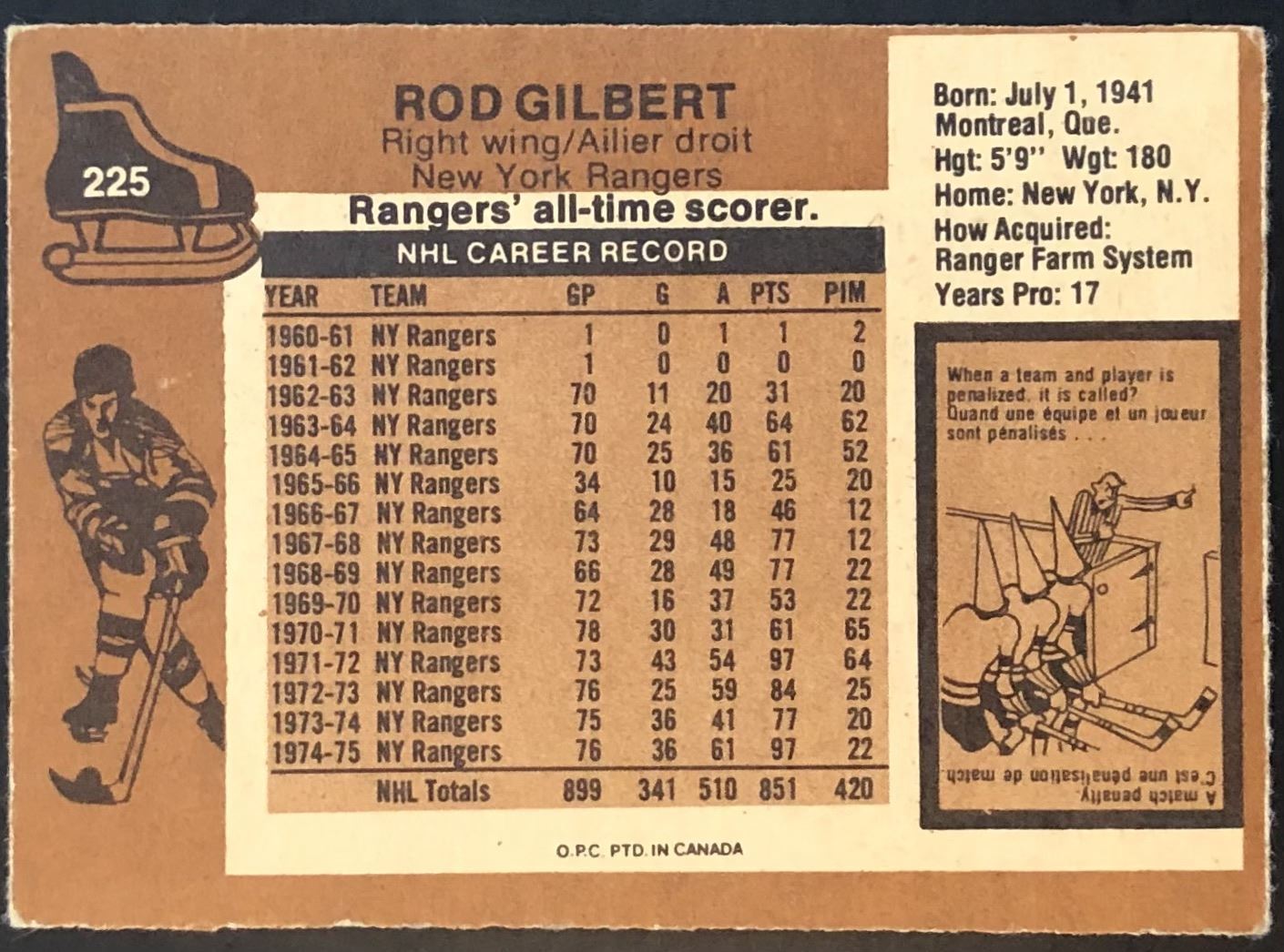 Card #225 NHL, hockey, vintage, OPC, hall of fame