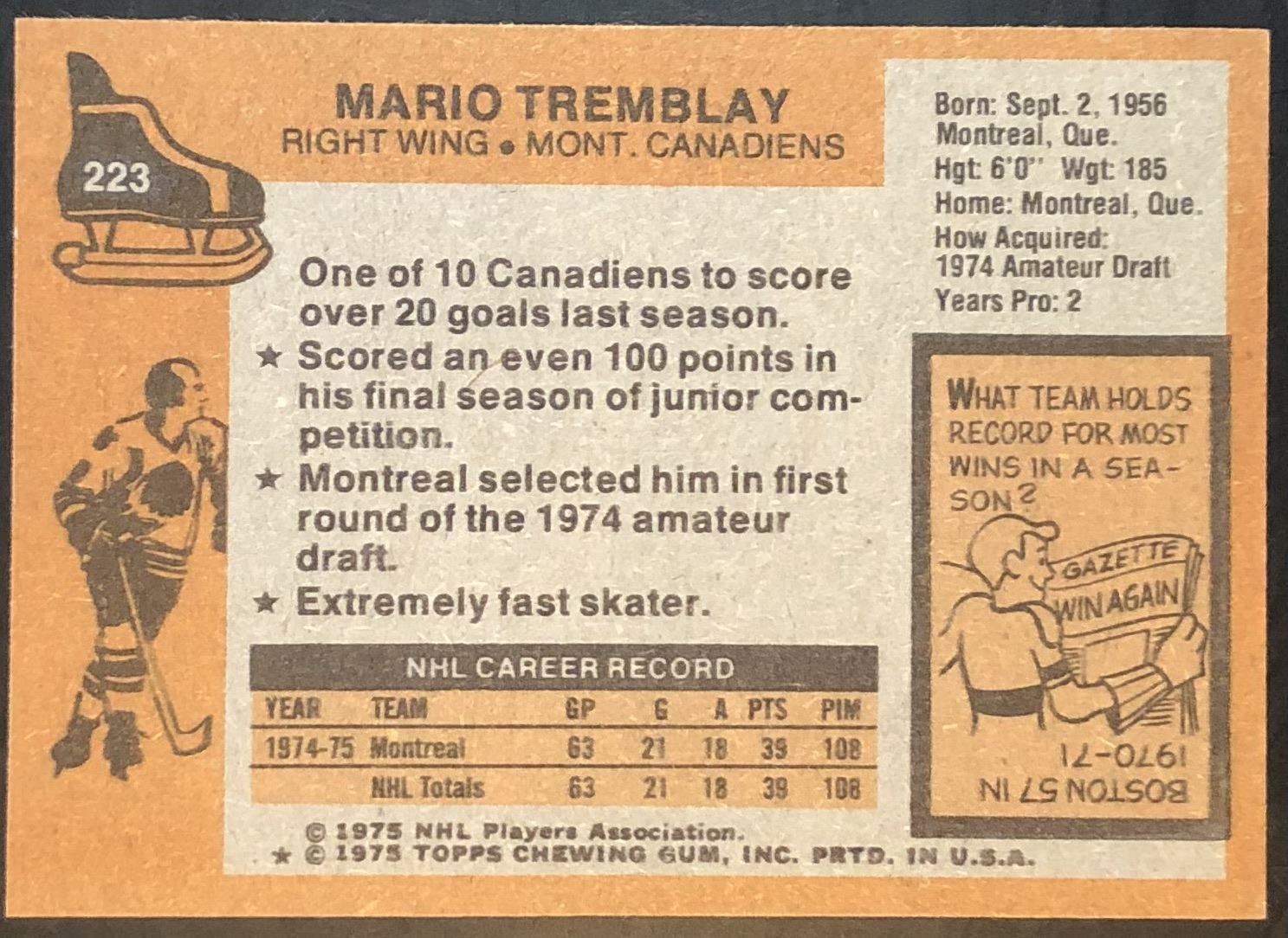 Card #223 NHL, hockey, vintage, rookie