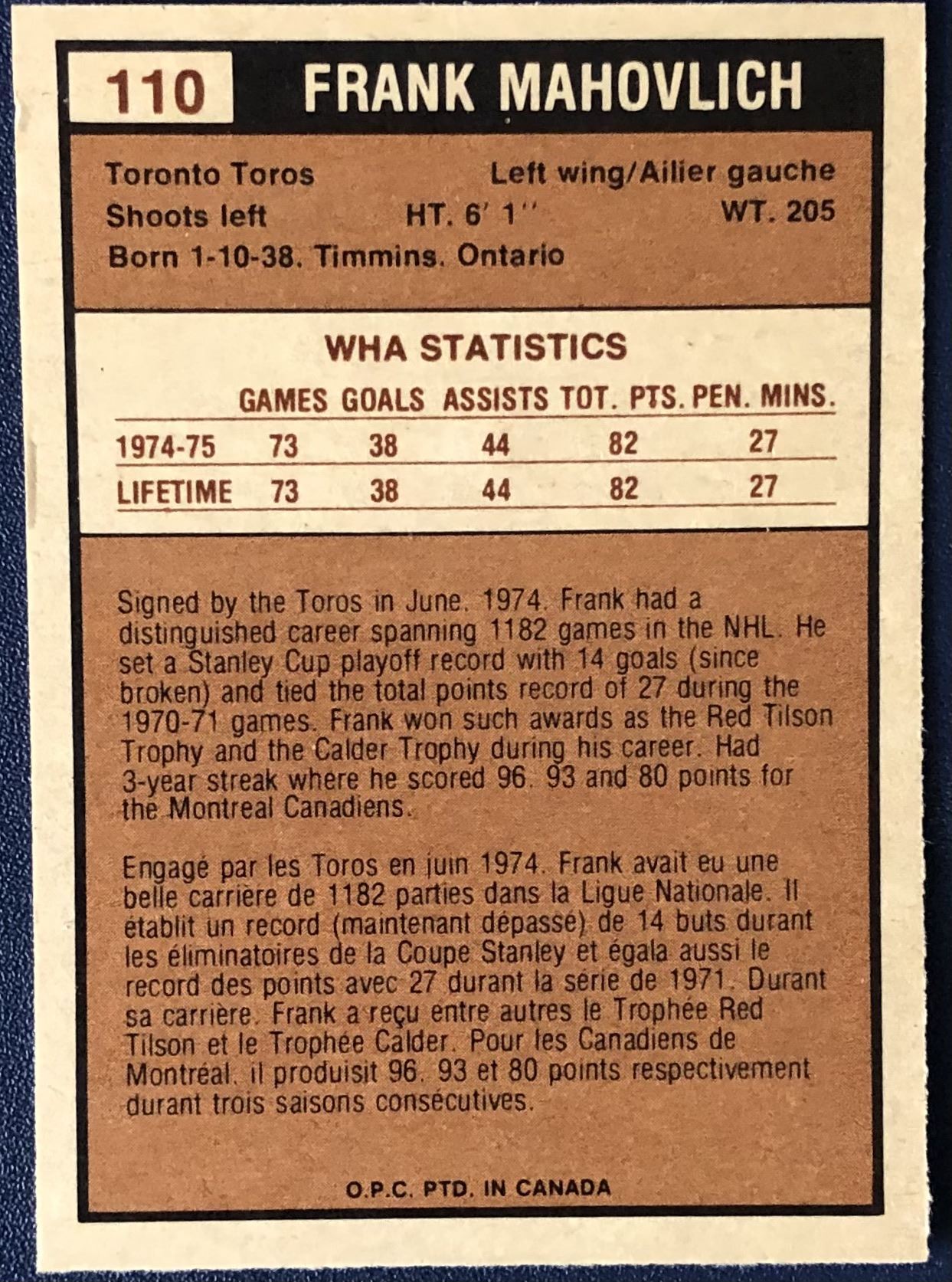 Card #110 vintage, hockey, WHA, OPC, hall of fame