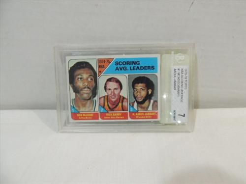 1975-76 TOPPS #1 BASKETBALL SCORE LEADERS CARD. GRADED BCCG NEAR MINT 7. MCADOO, BARRY AND KAREEM. AS SHOWN. VIEW PICTURE FOR DETAIL.
