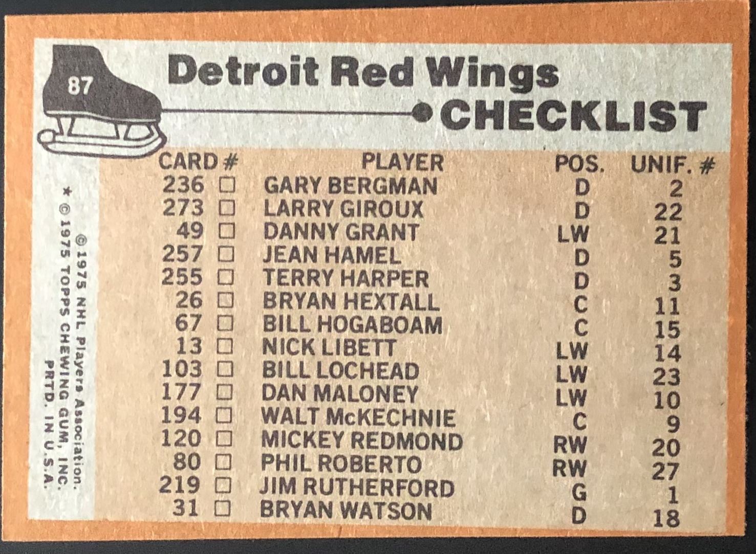 Card #87 hockey, NHL, vintage