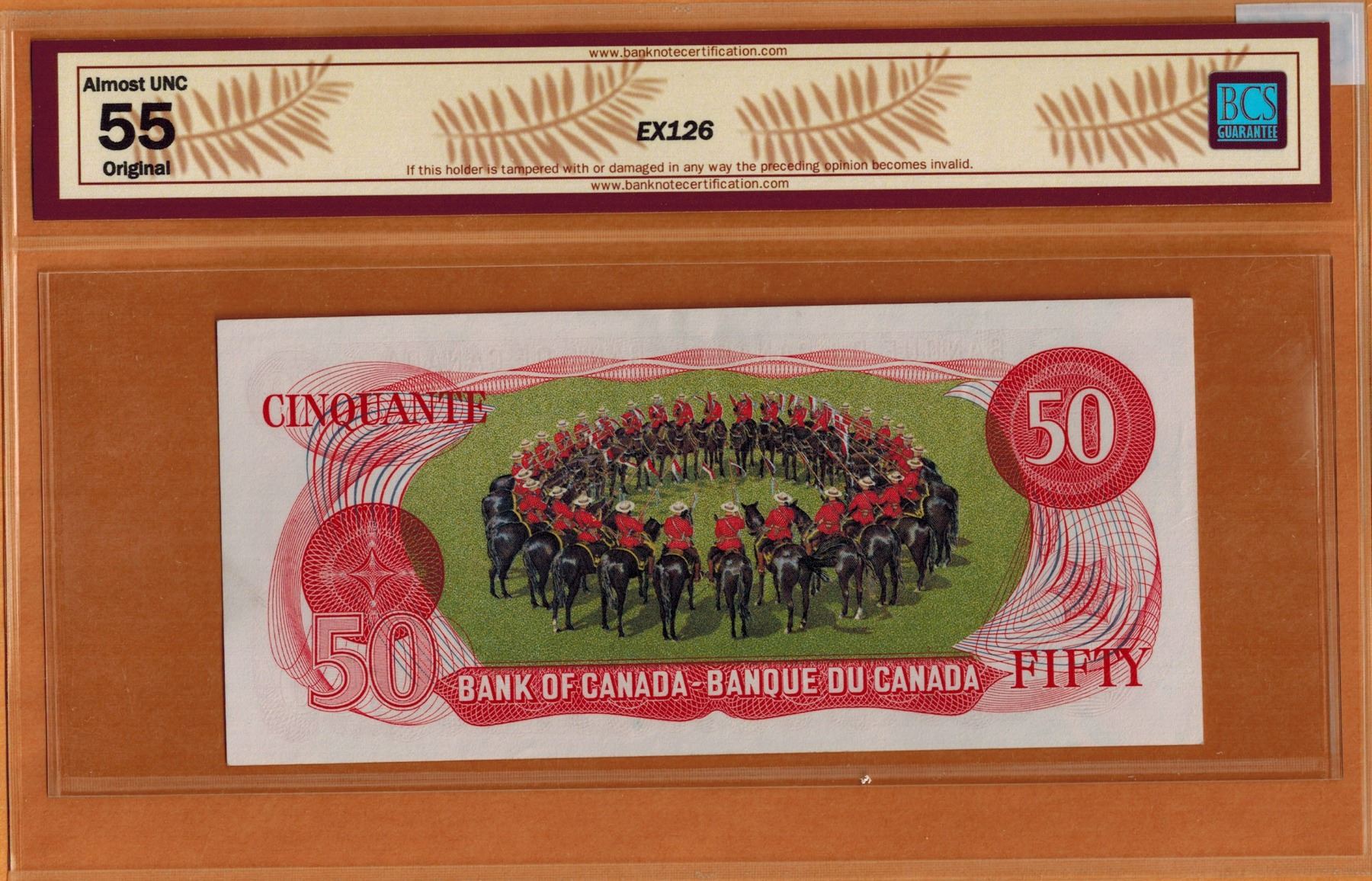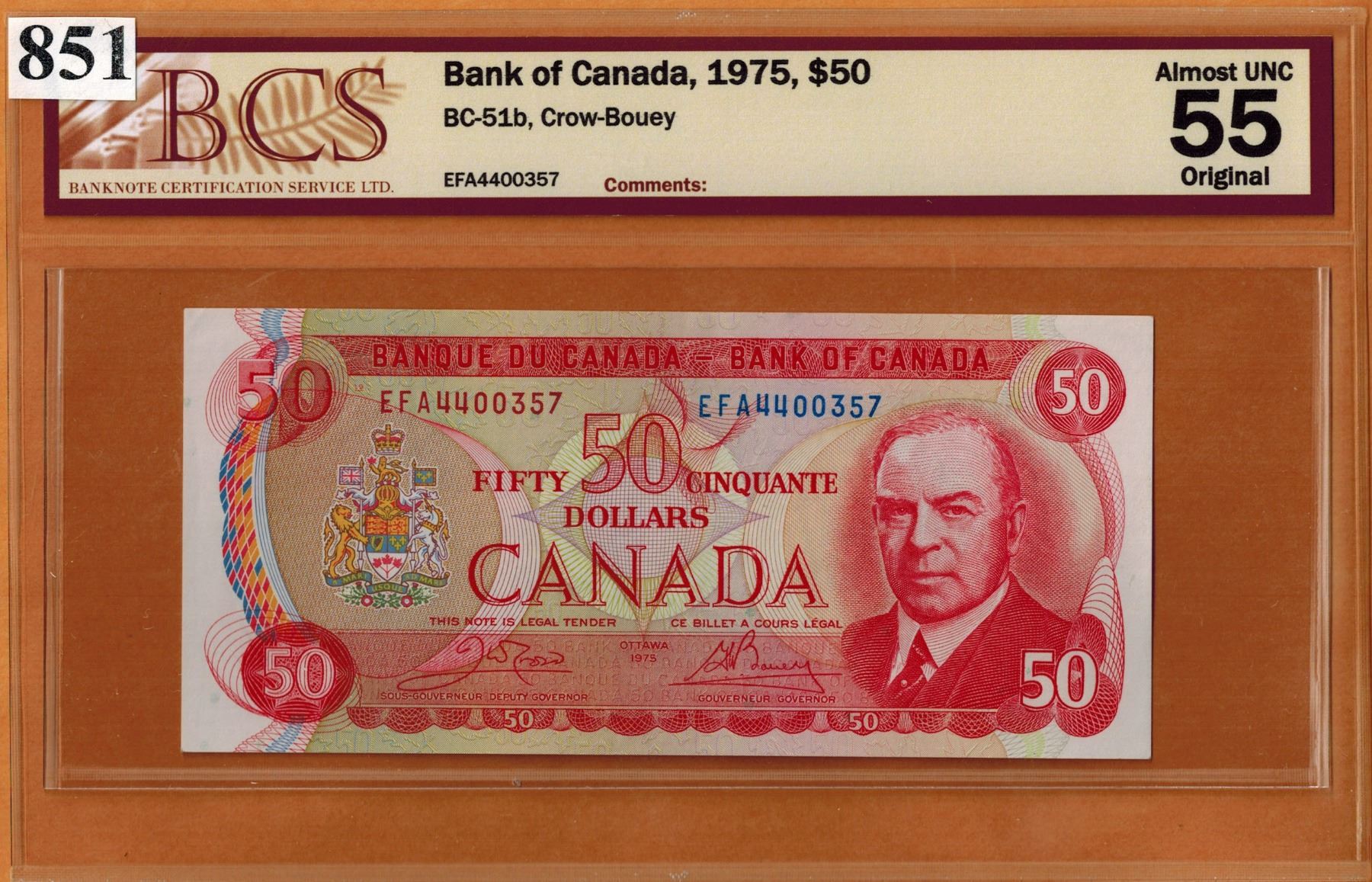 1975 BANK OF CANADA $50.00 BANKNOTE - BCS GRADED - ALMOST UNC 55