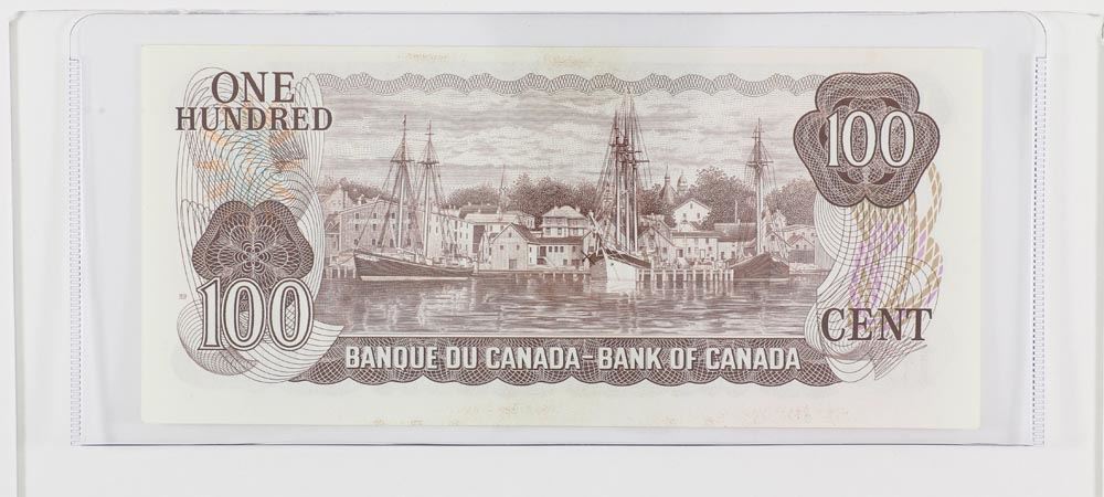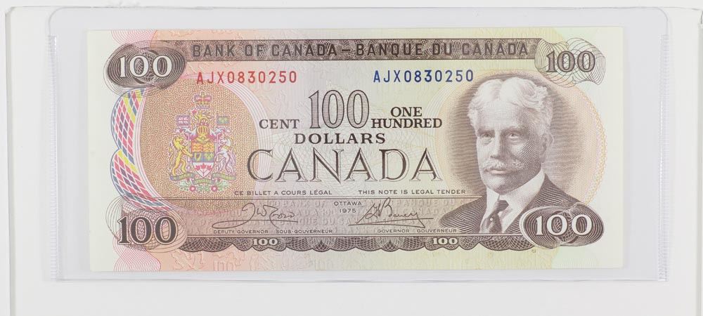 1975 Bank of Canada Replacement $100. BC-52bA, S/N: AJX0830250. A well centered Uncirculated Note.