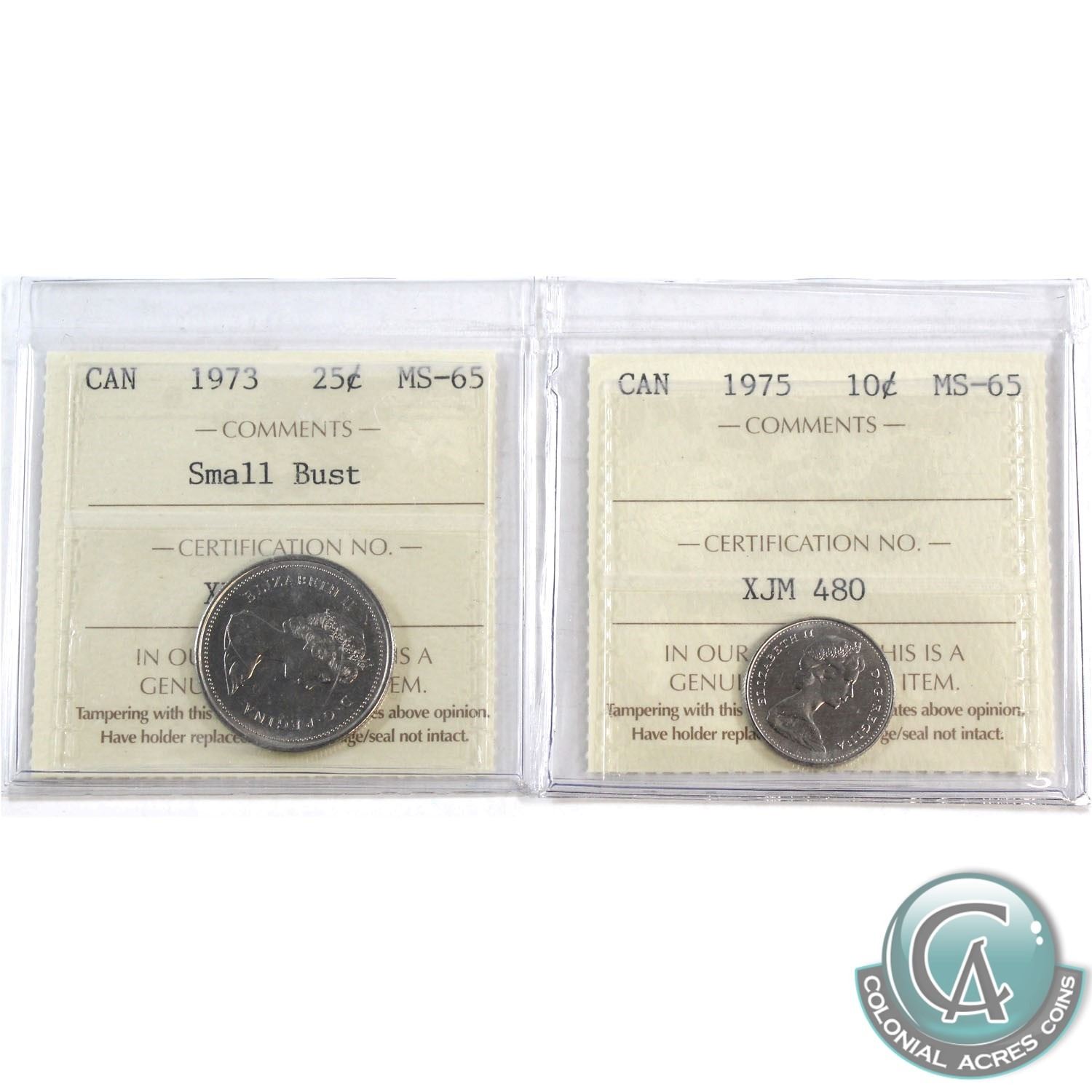 1975 Canada 10-cent ICCS Certified MS-65 & 1973 25-cent Small Bust MS-65. 2pcs