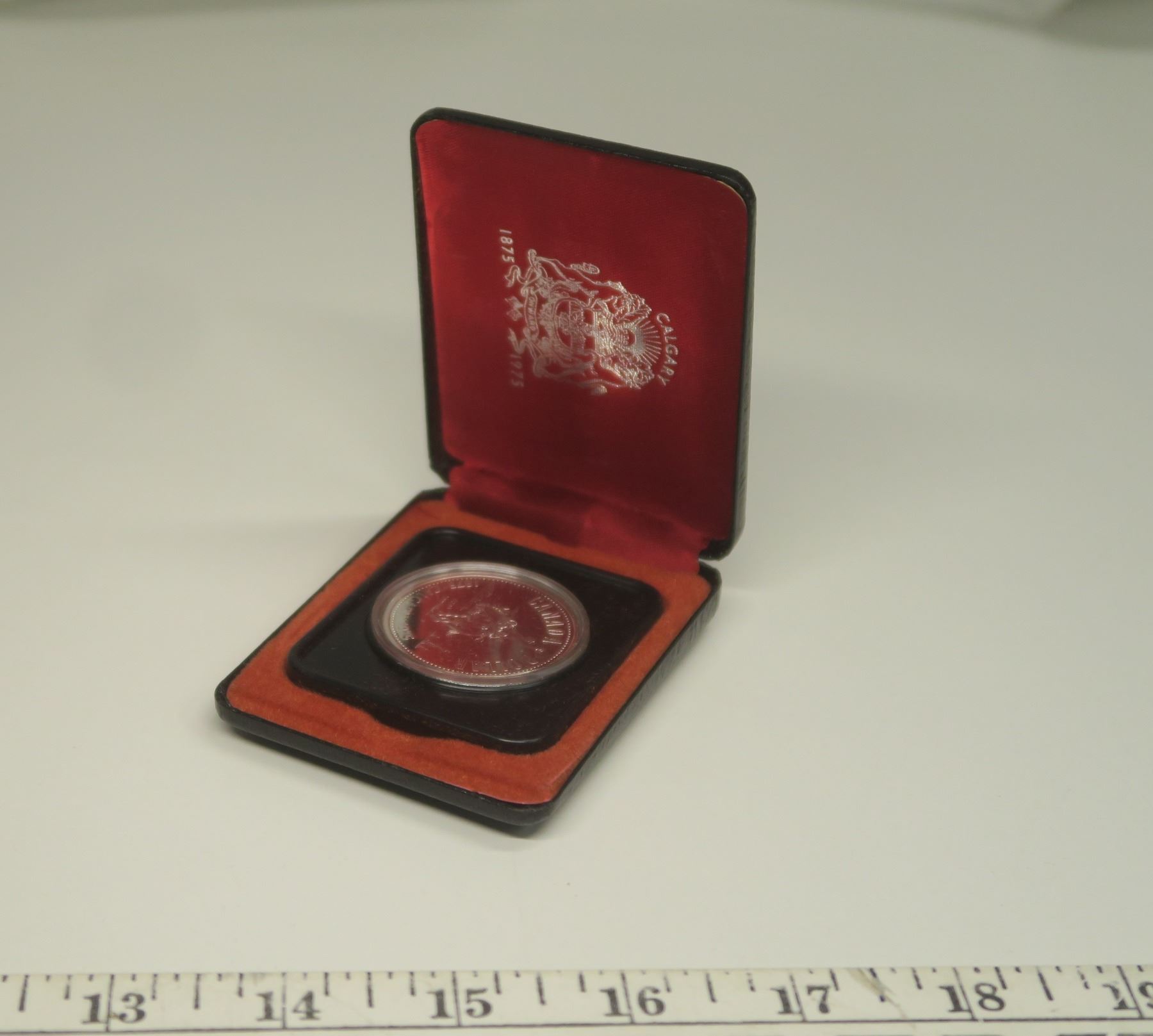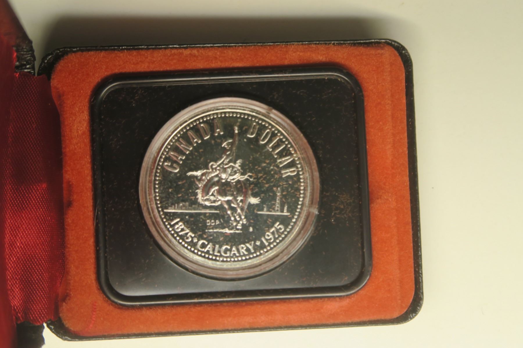 1975 Canadian Silver Dollar. Commemorates the 100th Anniversary of Calgary. Specimen. Housed in its original black clamshell case.