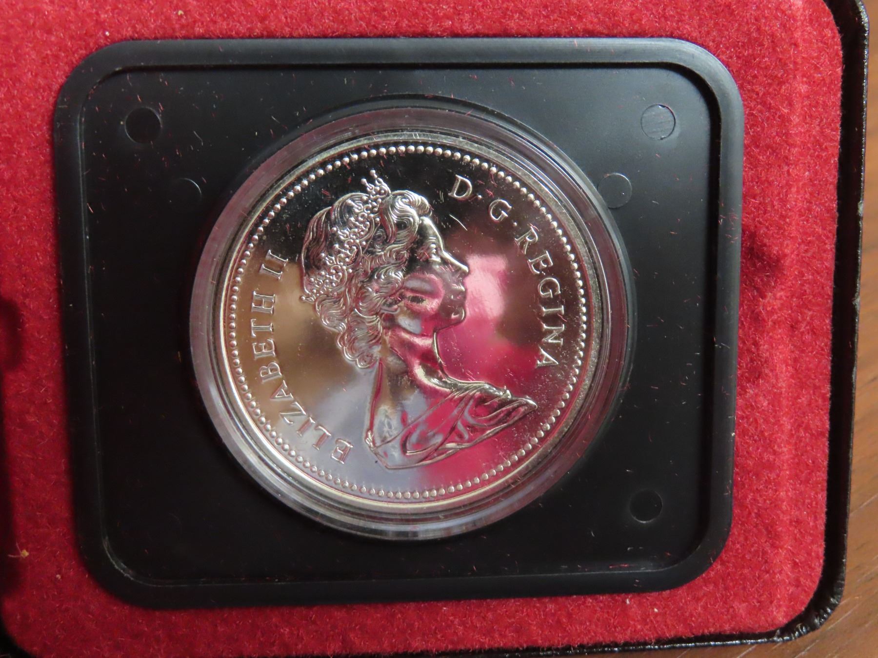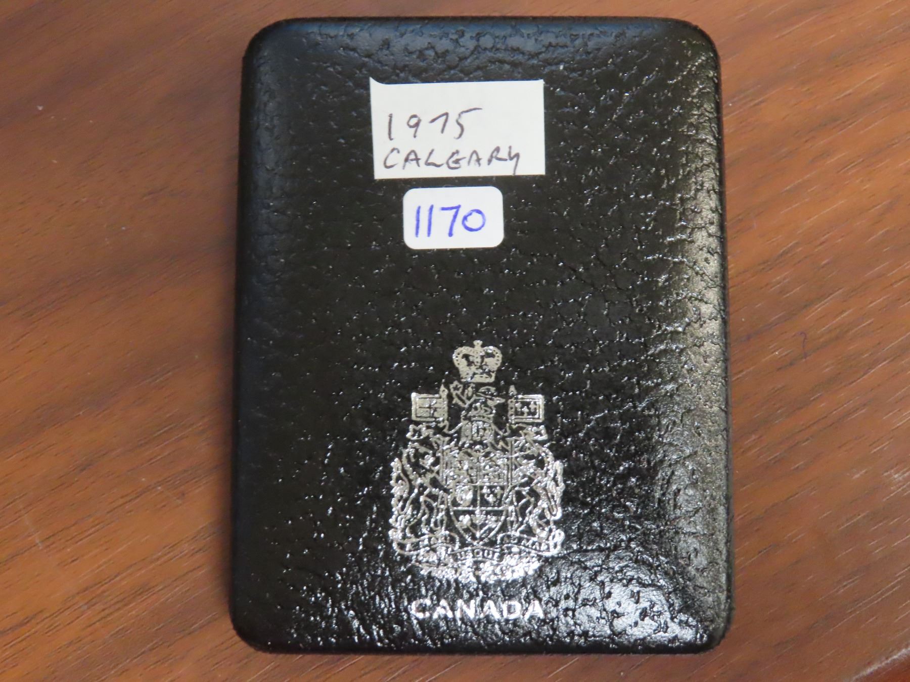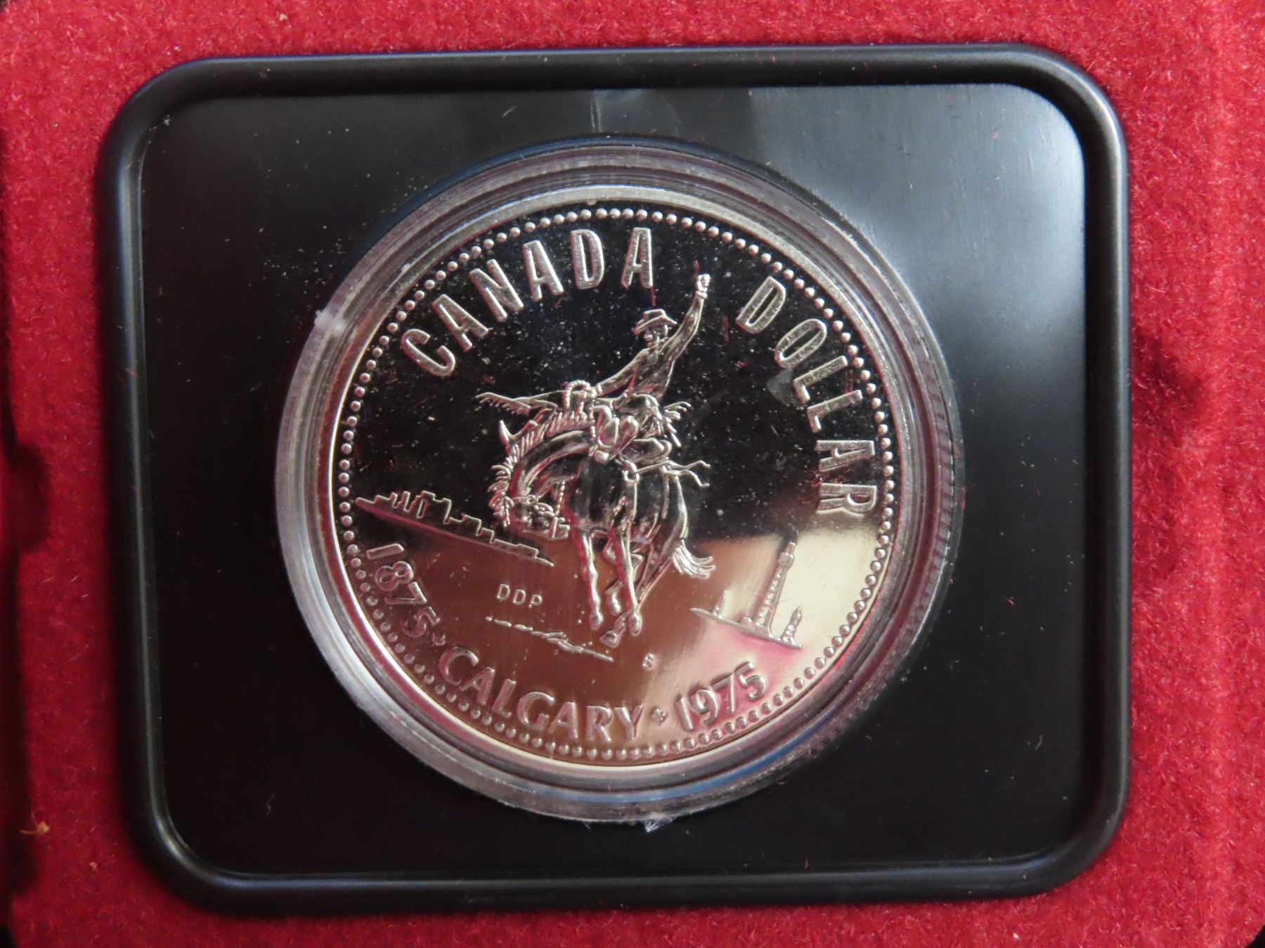 1975 Canadian Specimen Silver Dollar. Commemorates the 100th Anniversary of Calgary. Cowboy riding a bucking bronco. Bright White. Housed in its original Royal Canadian Mint black clamshell case of issue.