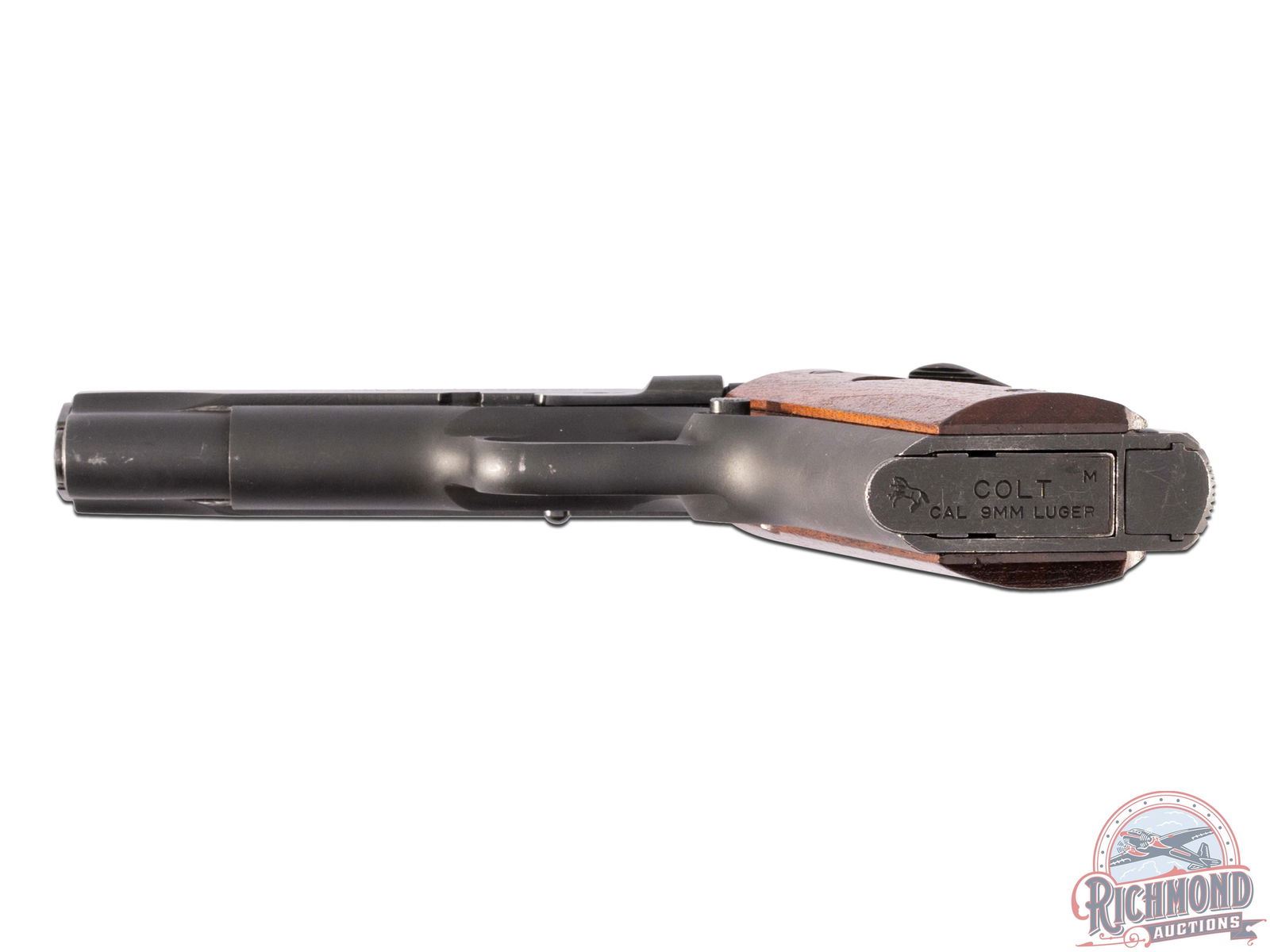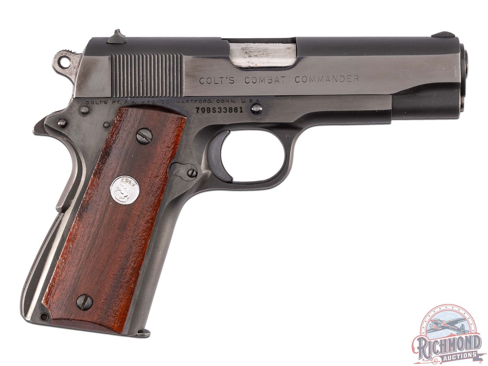 Manufactured in 1975. This nice Combat Commander features a 4-1/4" barrel and iron sights. Left side of slide is stamped "COMBAT COMMANDER / COLT / 9MM LUGER CALIBER" with the Rampant Colt. Right side of the slide is stamped "COLT'S COMBAT COMMANDER" with a single line Colt address on the frame above the serial number. Finished in a satin black throughout the frame and polished blue slide. Chambered for the popular 9mm Luger with a 9-round factory Colt magazine. Manual thumb safety and grip safety. Serrated trigger and back strap. Fitted with factory walnut grips with silver tone Colt medallion. CALIBER: 9mm. S/N: 70BS33861. FFL STATUS: Modern.
