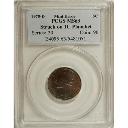<B>1975-D 5C Jefferson Nickel--Struck on 1C Planchet--MS63 PCGS.</B></I><BR><BR><b>Shipping:</b> Coins & Currency (<a target="_blank" href="http://www.heritageauctions.com/common/shipping.php">view shipping information</a>)