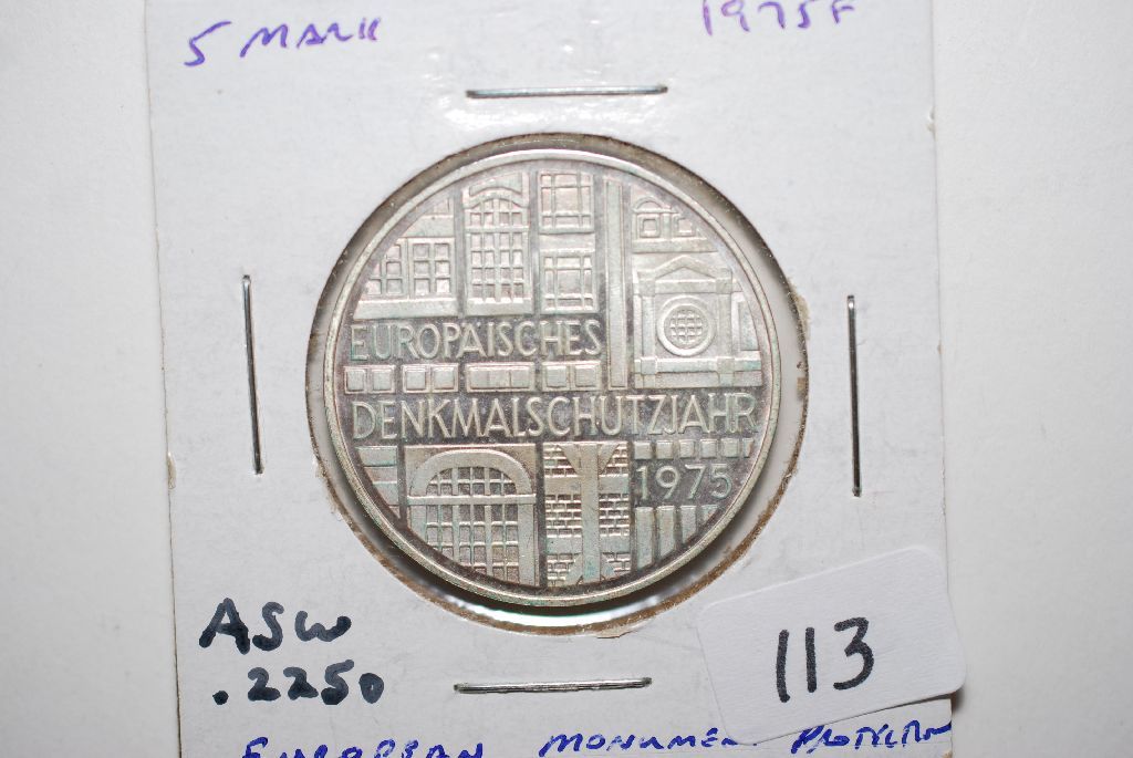 1975-F German 5 Deutsche Mark Foreign Coin; European Monument; .2250 ASW; EST. $10-20
