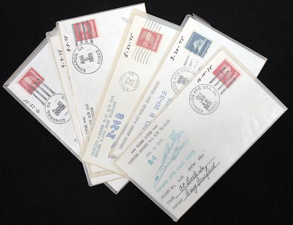 1975, FLOWN, US X-24B Test Flight Covers. Lot of five different envelopes, each flown on a different flight and each signed by various pilots and test pilots. Included are flights from 3/20, 5/22, 8/5 (Manke), 9/9 (Dana), 9/23 (Dana). All of these flown covers are quite scarce and seldom available. Souvenir commemorative covers look similar, but that is like saying Apples and Oranges are both fruit. There is a definite difference. ALSO included is a 1975 FLOWN B-1 cover carried on the No. 10/10 test flight and signed by the pilot and co-pilot. Attractive.