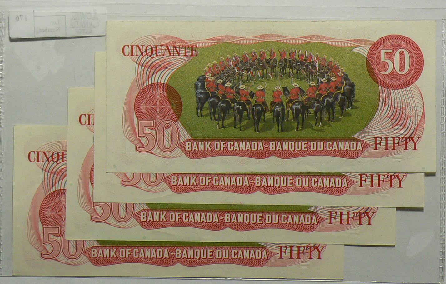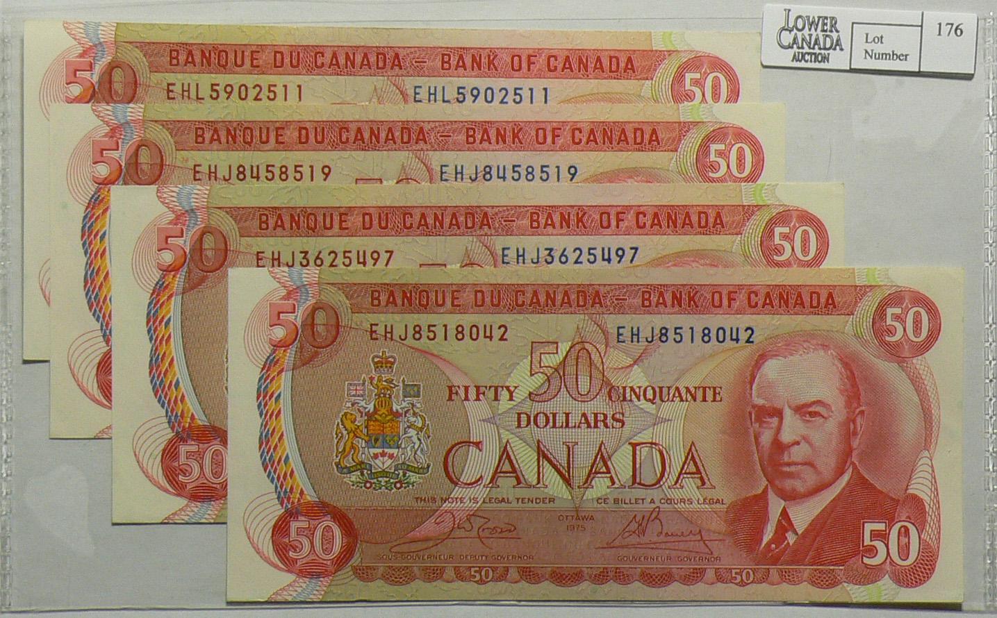1975 Fifty Dollars, BC-51b, 4 x AU/UNC, Crow Bouey, serial EHJ(3) & EHL. Lot of 4 notes