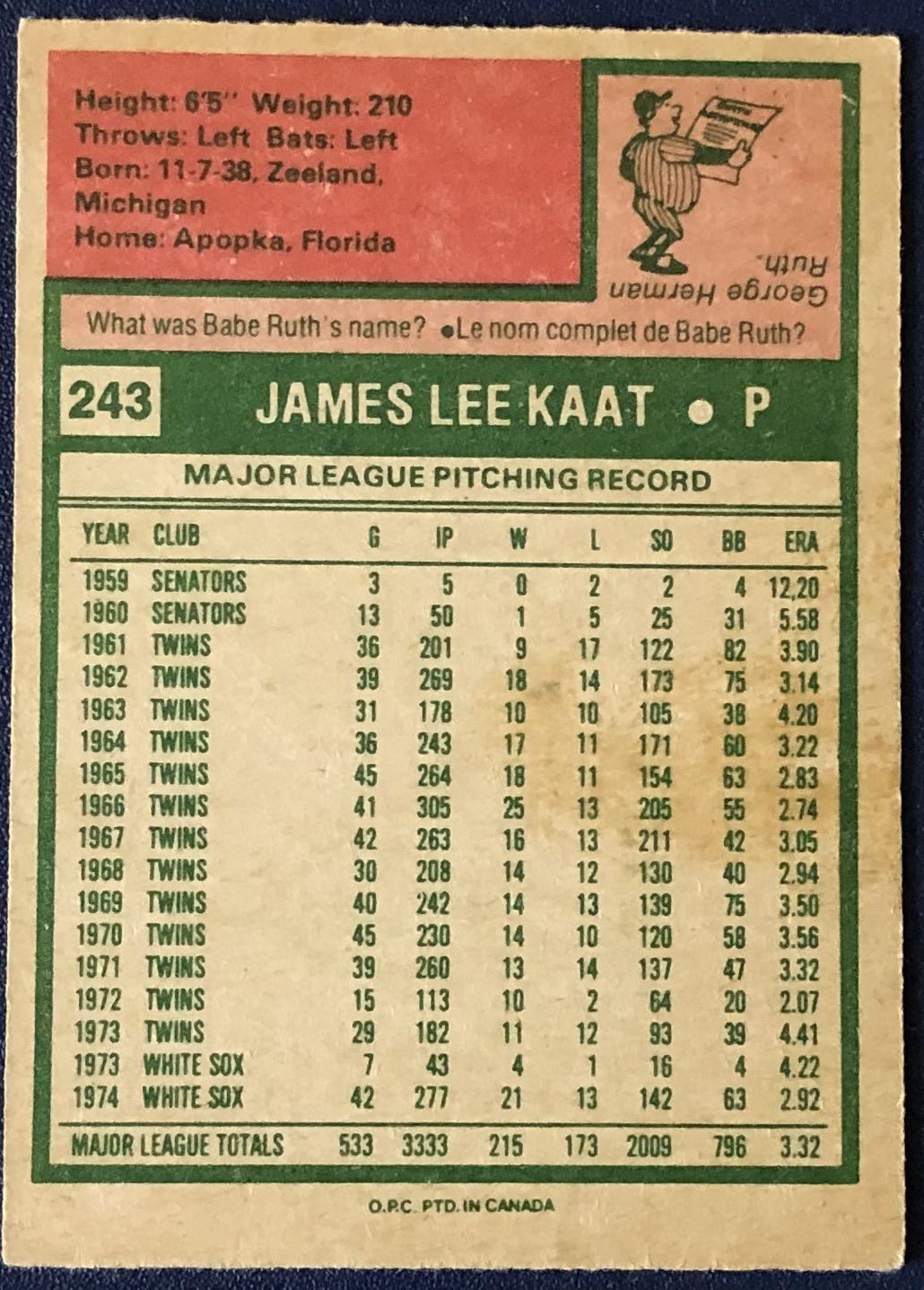 Card #243 some staining on card's back vintage, MLB, baseball, OPC, hall of fame
