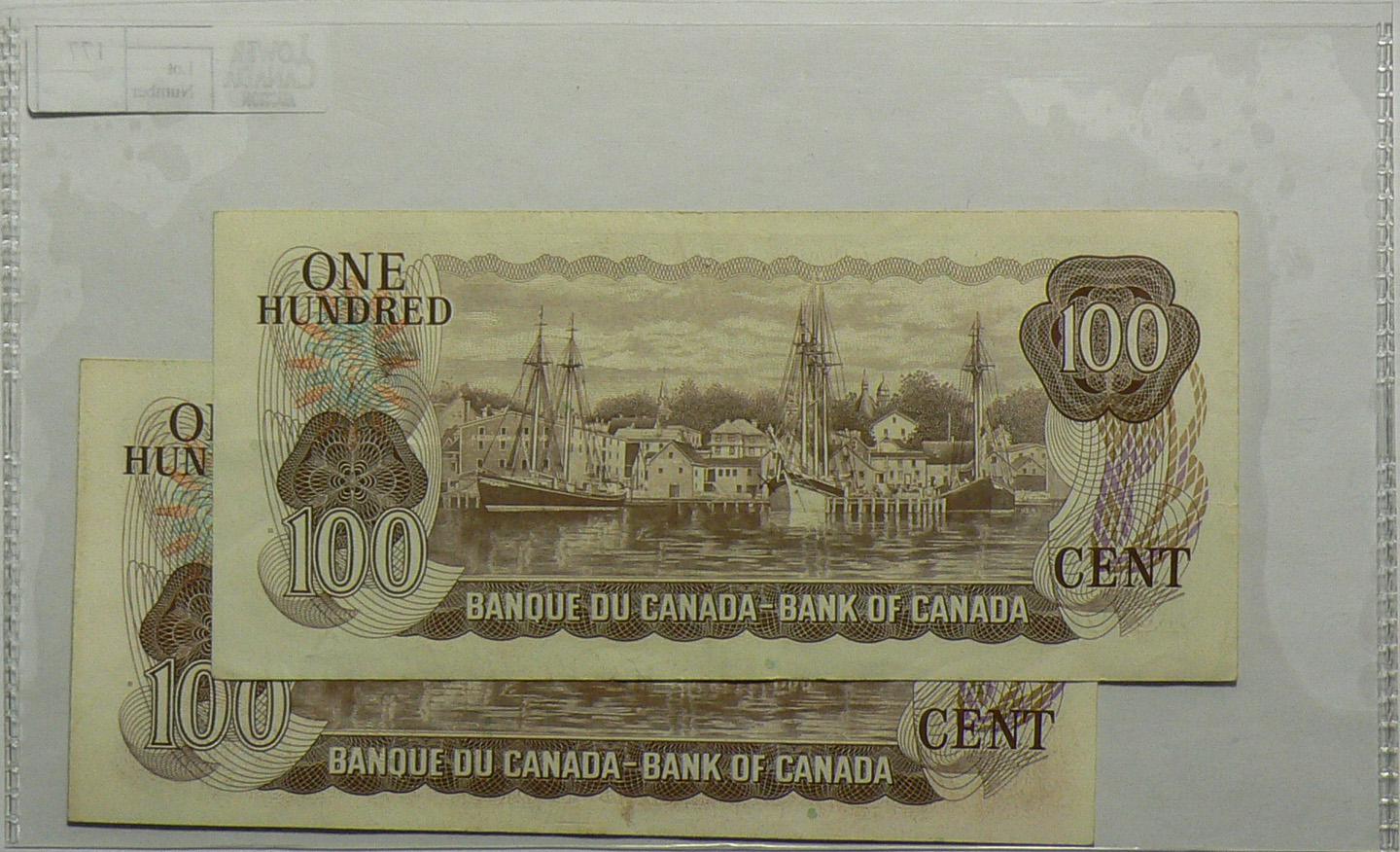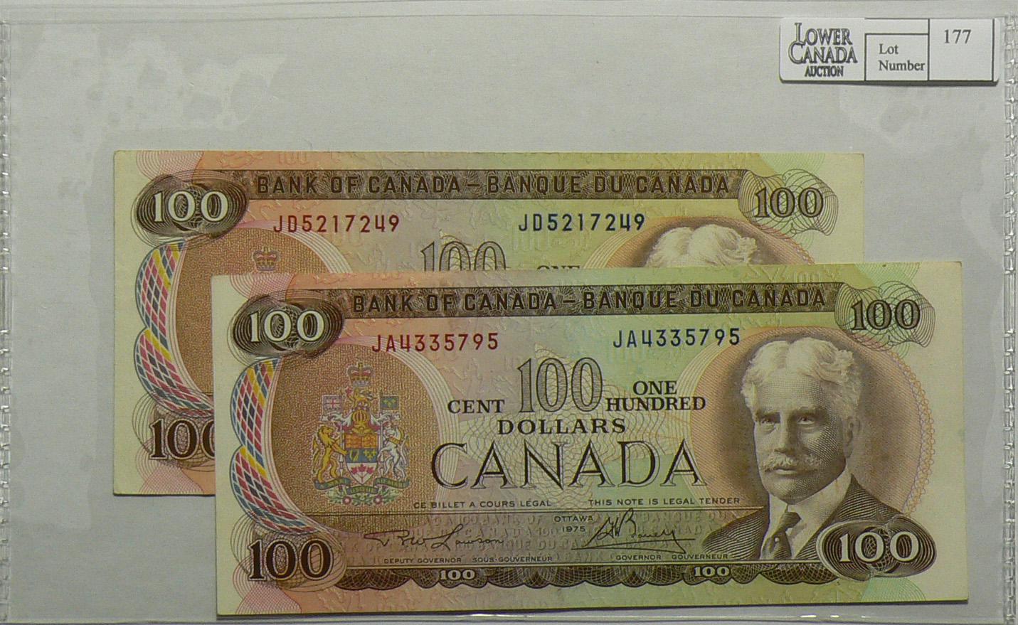 1975 One Hundred Dollars, BC-52a, 2 EF, Lawson Bouey, serial JA4335795 & JD5217249.