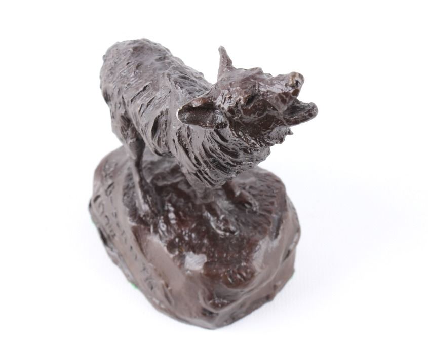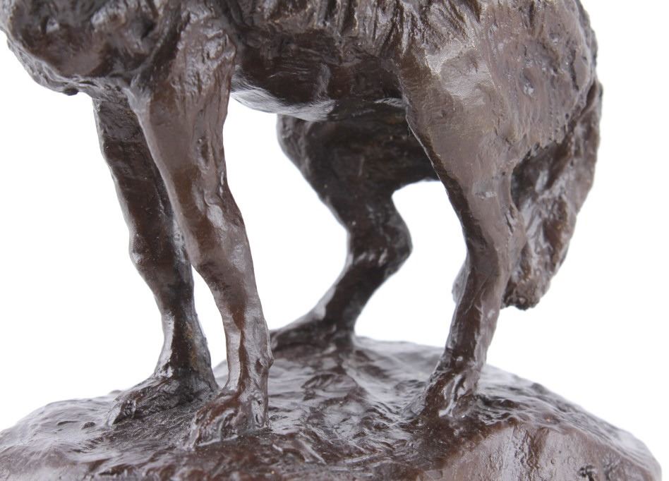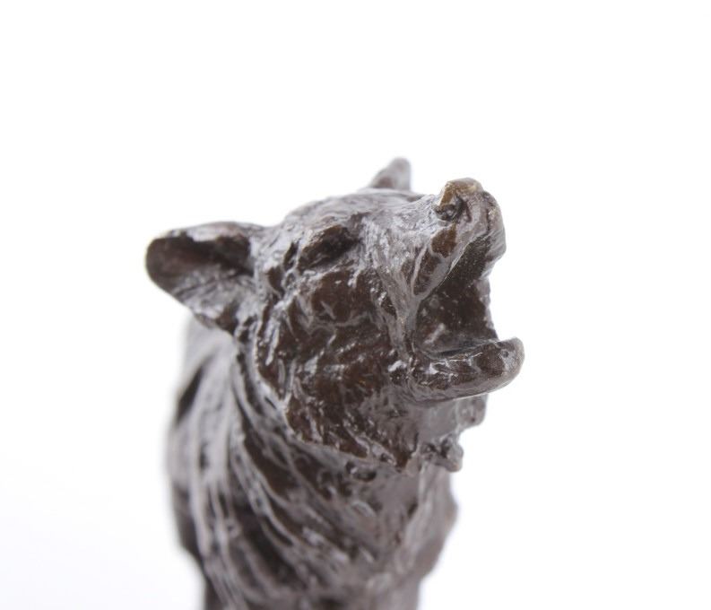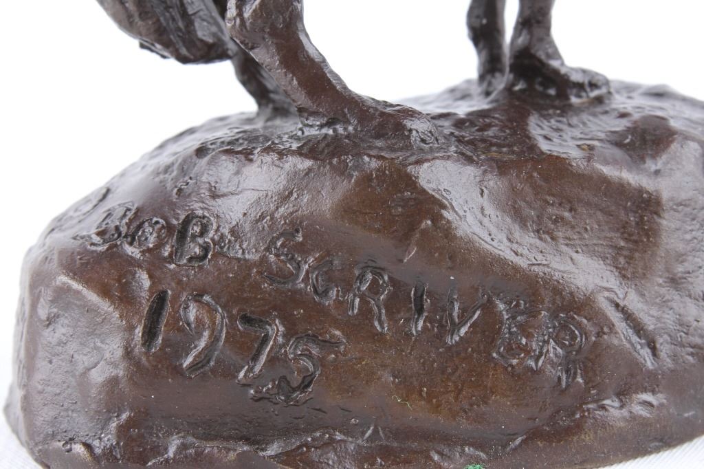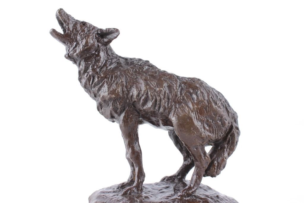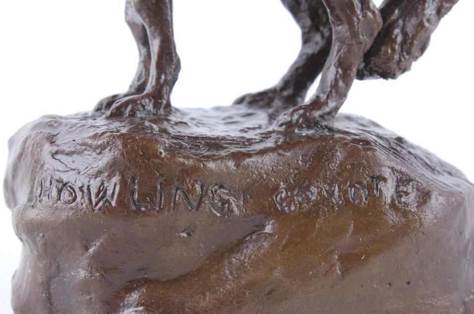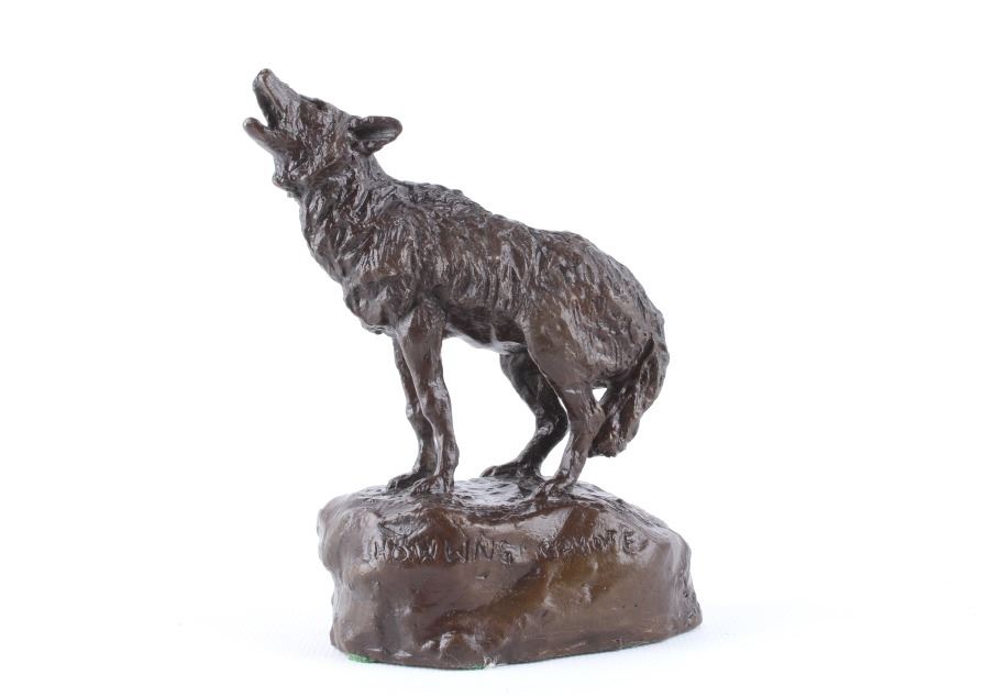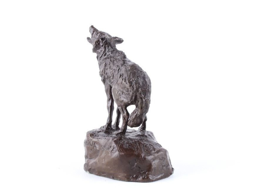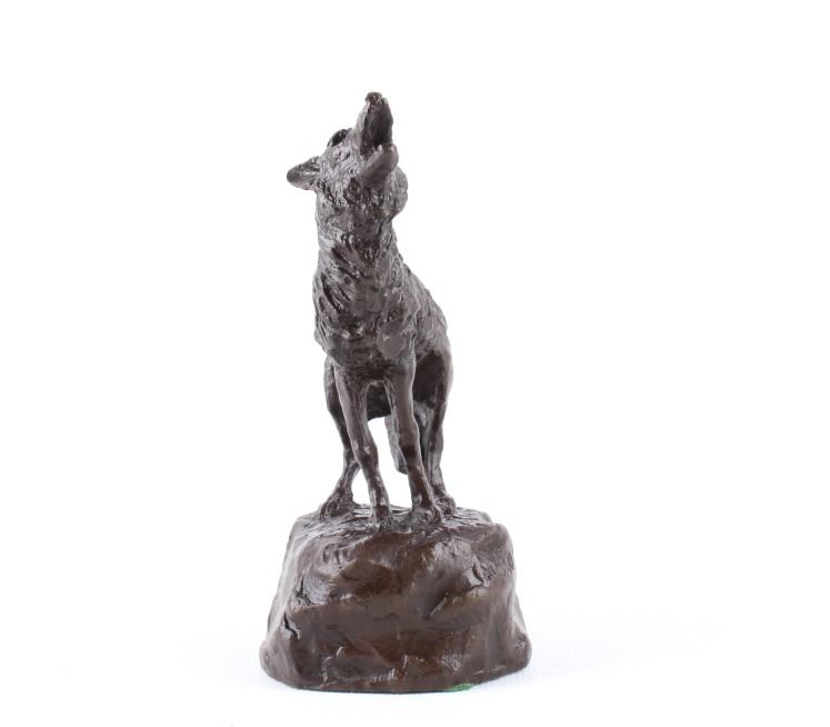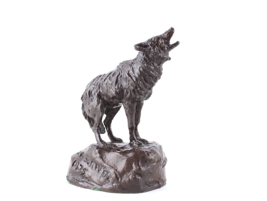 For your consideration is this 1975 original Bob Scriver howling coyote bronze numbered 20/150. Robert Macfie Scriver (1914-1999) was born in Browning, Montana (in the heart of the Blackfoot Indian Reservation) in 1914. Scriver began sculpting using taxidermy to learn his craft of making wildlife bronzes. By 1962 he became a charter member of the Society of Animal Artists, had been accepted into the prestigious Cowboy Artists of America, listed in Who’s Who in American Art, and a member of the National Sculpture Society, and the National Academy of Western Art. The bronze shows a coyote howling at the moon on a bronze base. The condition of this of this bronze is good with no obvious signs of damage to the bronze and in good display condition. The measurements of this bronze are 5 1/4" x 4 1/2"