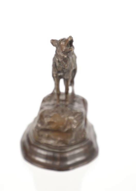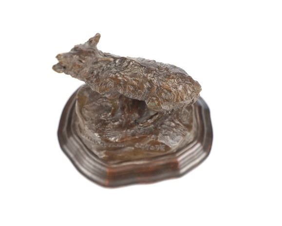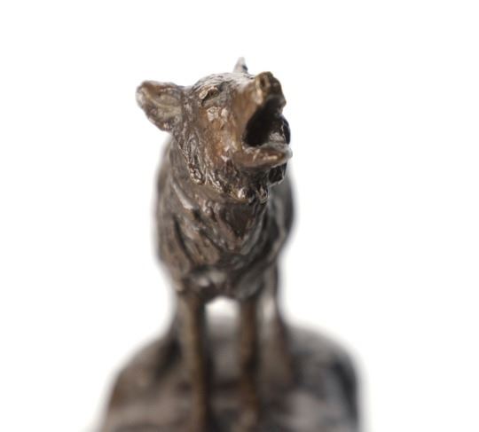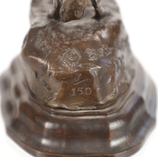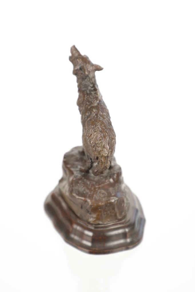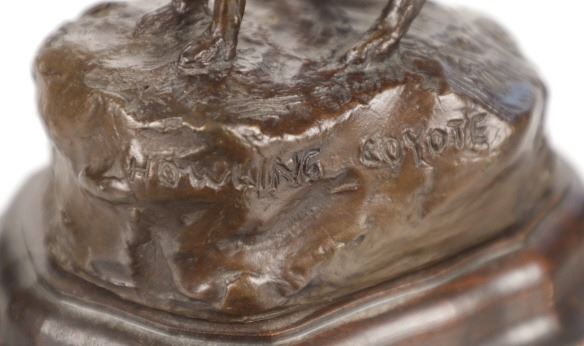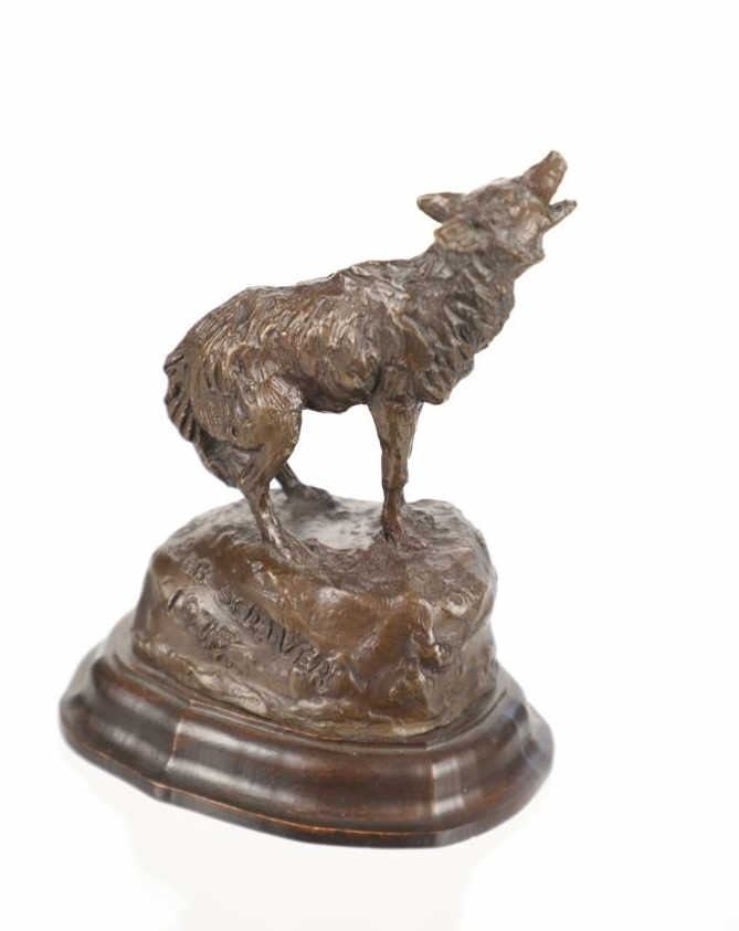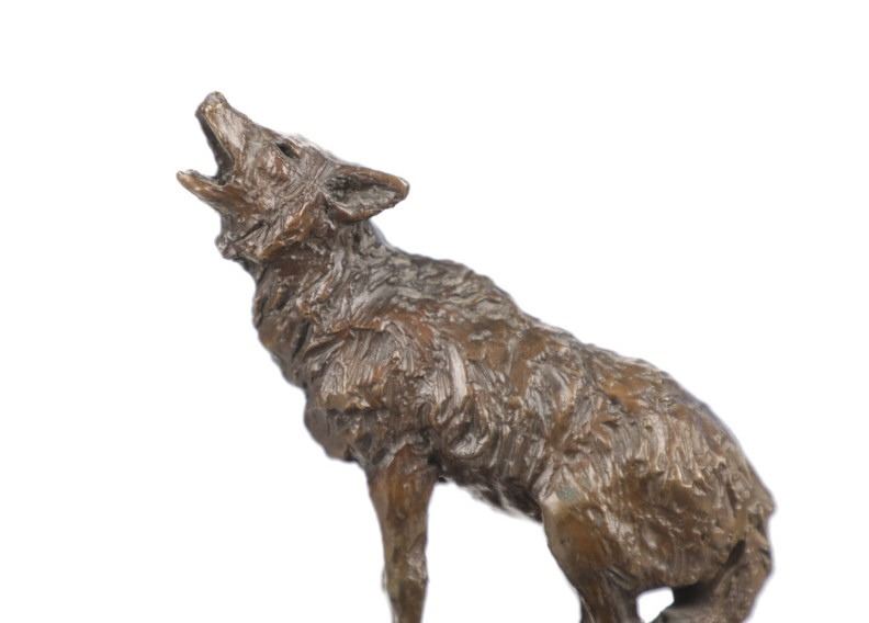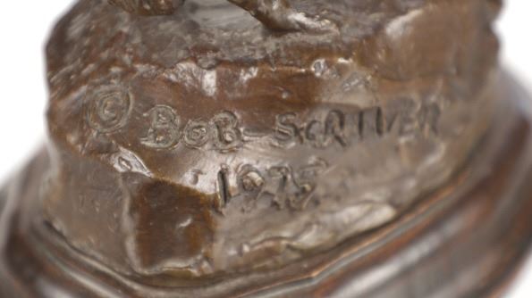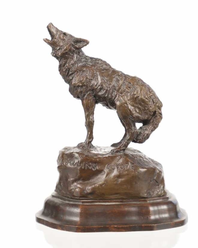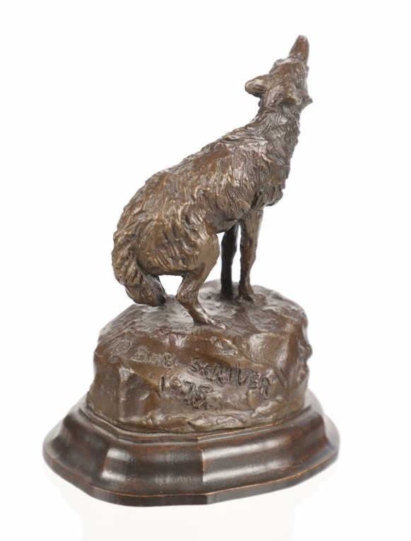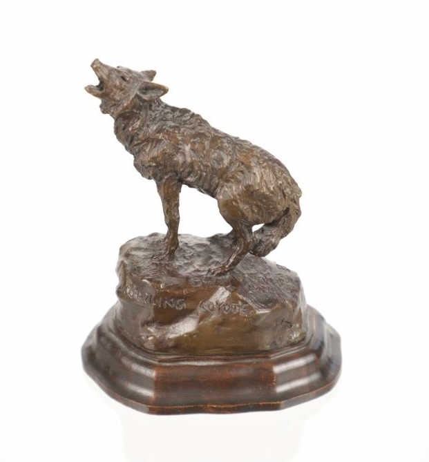 Featured in this lot is this 1975 original Bob Scriver howling coyote bronze numbered 7/150. Robert Macfie Scriver (1914-1999) was born in Browning, Montana (in the heart of the Blackfoot Indian Reservation) in 1914. Scriver began sculpting using taxidermy to learn his craft of making wildlife bronzes. By 1962 he became a charter member of the Society of Animal Artists, had been accepted into the prestigious Cowboy Artists of America, listed in Who’s Who in American Art, and a member of the National Sculpture Society, and the National Academy of Western Art. The bronze shows a coyote howling at the moon on a bronze base and is mounted on a raised wooden shield. The condition of this bronze sculpture is good with no obvious signs of damage and shows good overall condition. The measurements of this bronze is 6 1/4" x 3 1/2" x 4 1/2". The collective weight of this bronze is 2lb.