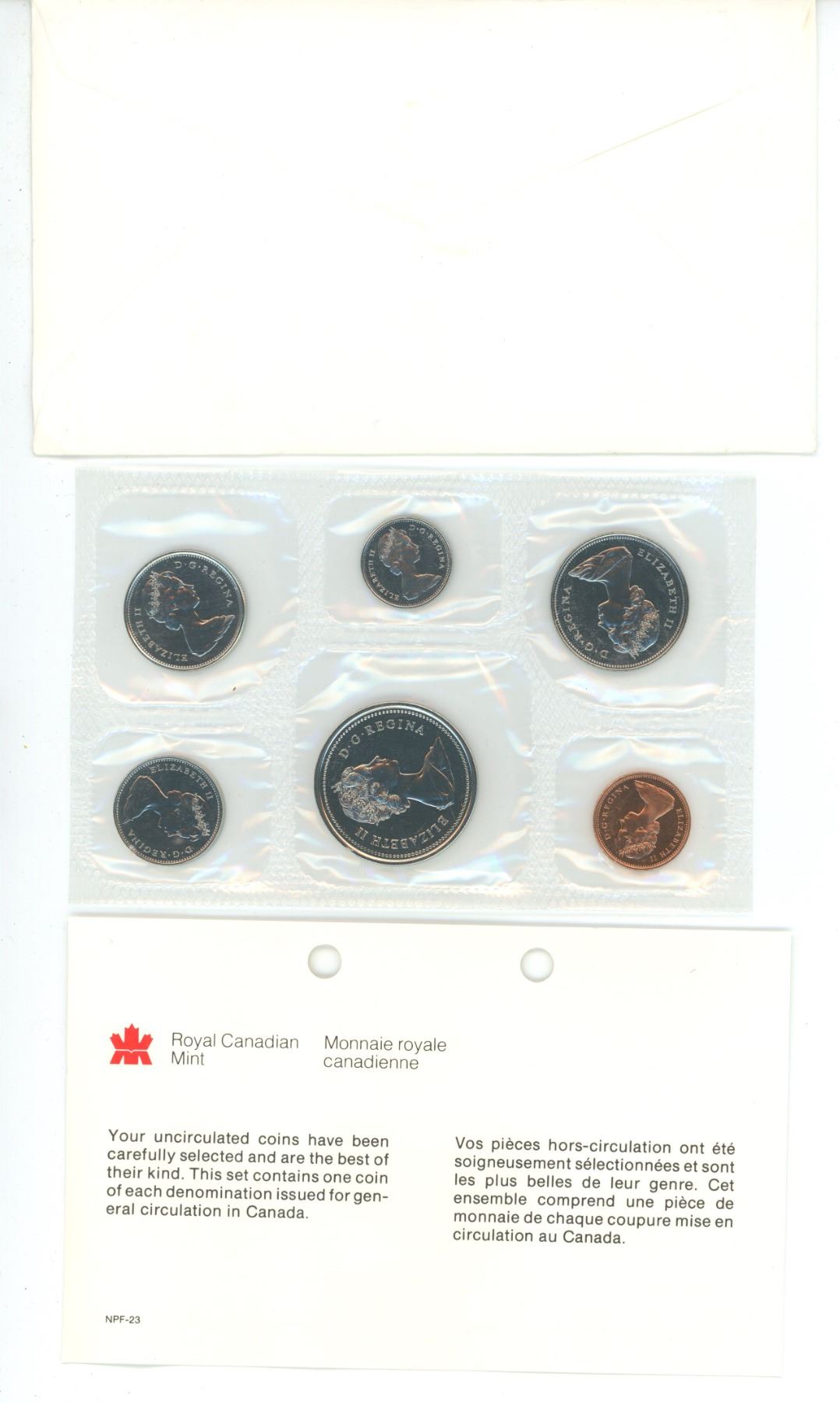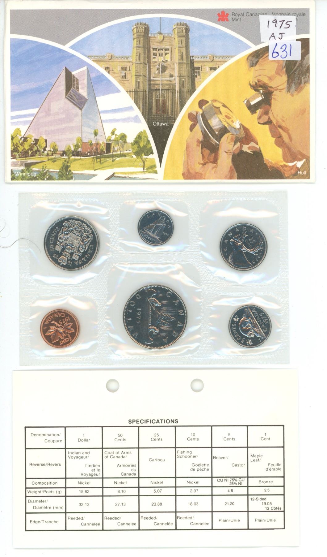 1975 Proof Like Set. 6-coin set as issued by the Royal Canadian Mint. The dollar has Attached Jewel.