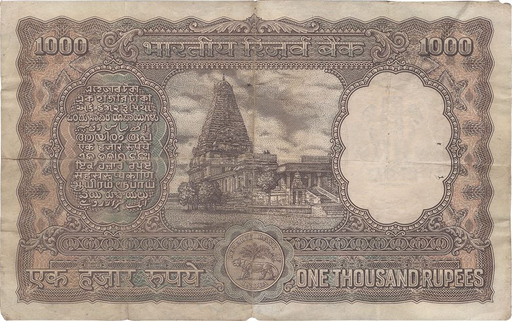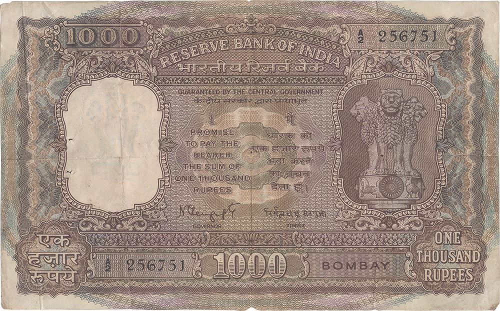 1975,1000 Rupees,Reserve Bank of India, Bombay Circle, Fifth Issue,signed byN C Sengupta, promise text signature in Hindi English in centre on obverse,serial no in black, S.No. A2 256751,(KJ RR #6.9.4.1),stained, multiple folded, pin hole, thread holes,about very fine, Rare.