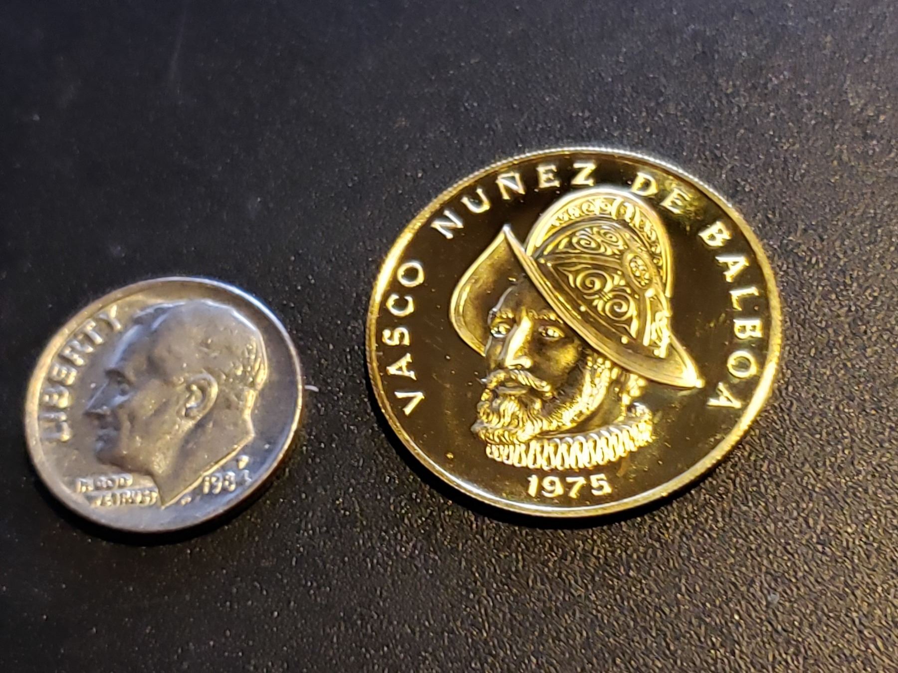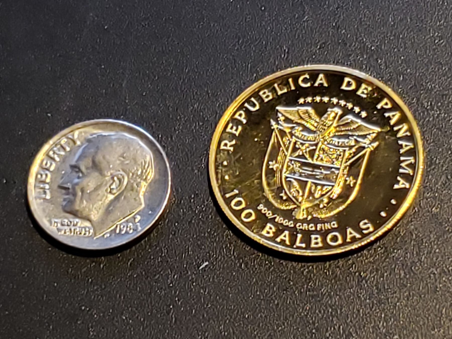 One 1975 Republic of Panama 100 Balboas Gold Coin. Metal Content: 0.2361 troy oz. Gold Purity: .900, Thickness: 1.3 mm, and Diameter: 26 mm.