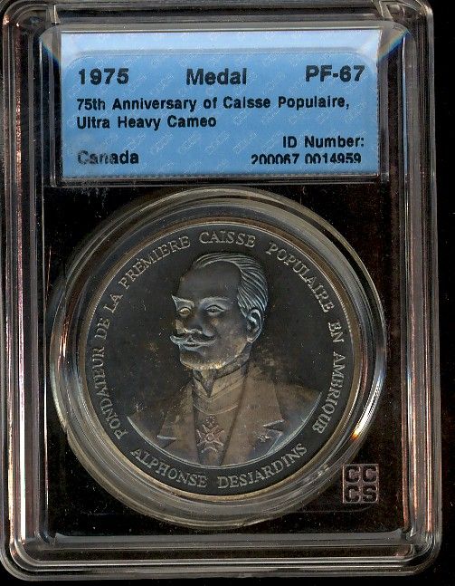 1975 Silver Medal Commemorating the 75th Anniversary of Caisse Populaire ( Credit Union ), CCCS PF-67; Ultra Heavy Cameo. Beautiful blue toning similar to coins from the 1967 Specimen Set with the 20 dollars gold. Housed in CCCS hard casing.