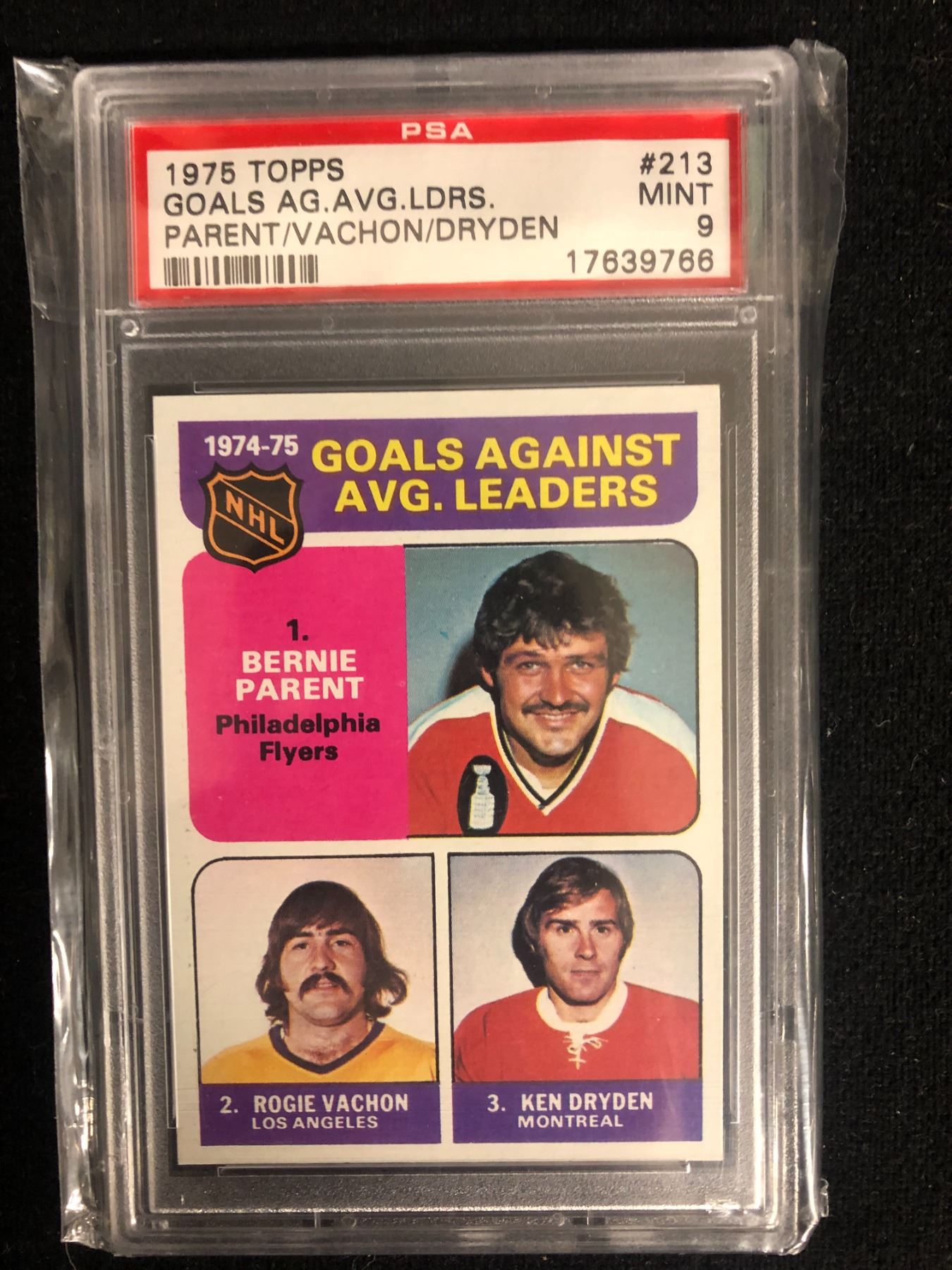 1975 TOPPS #213 GOALS AG. AVG. LDRS. PARENT/VACHON/DRYDEN (MINT 9)