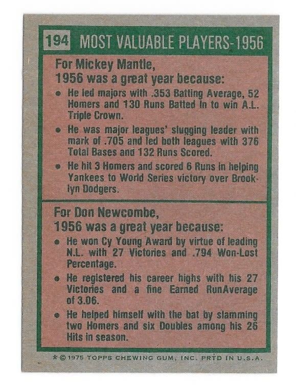 1975 Topps 1956 MLB Most Valuable Players Mickey Mantle Don Newcombe Card #194
