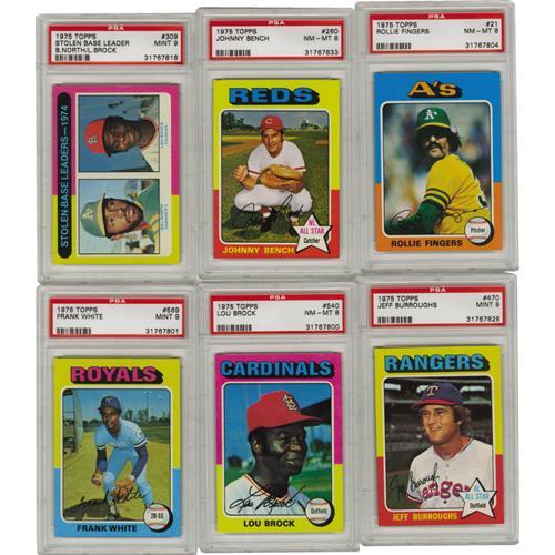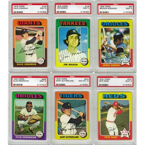 <B>1975 Topps Baseball Complete Set (660.</B></I> The 1975 Topps baseball series consists of 660 cards and was a collector favorite from the outset due to its strong selection of rookie cards. A total of thirty-five cards have been graded by PSA with an aggregate SMR value of $985. Graded cards - <B>PSA GEM MT 10:</B></I> #522 Sutherland; (21) <B>PSA MT 9:</B></I> #50 B. Robinson, 136, 156, 166, 224, 239, 273, 309, 320 Rose, 323, 341, 404, 405, 411, 455, 470, 479, 493, 569, 594, 609; (11) <B>PSA NM-MT 8:</B></I> #21 Fingers, 52, 217, 260 Bench, 271, 351, 365, 367, 393, 416, 540 Brock; <B>PSA NM 7:</B></I> #124, 153. Ungraded cards include #1 Aaron RB (EX/MT), 5 Ryan RB (NM), 70 Schmidt (EX/MT), 223 Yount (EX/MT), 228 Brett (EX/MT), 500 Ryan (EX), 616 Rice (EX/MT), 620 Carter (EX/MT) and 660 Aaron (EX/MT). Grades 72% NM to NM/MT and 28% EX to EX/MT (some lesser).<BR><BR><b>Shipping:</b> Trading Card Set or Notebook, La (<a target="_blank" href="http://www.heritageauctions.com/common/shipping.php">view shipping information</a>)