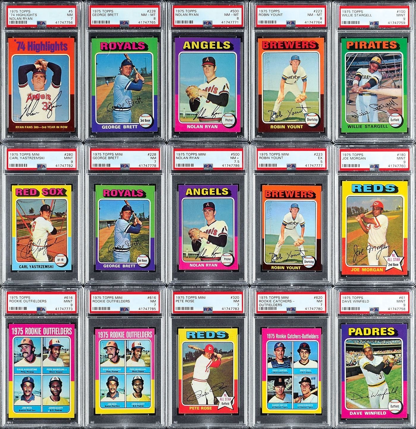 Includes: 1975 Regular - Graded Cards (23): PSA MINT 9 - 6 cards w/#61 Winfield, 100 Stargell, 180 Morgan, 616 Rice RC, 618 McGregor RC and 623 Hernandez RC. PSA NM-MT+ 8.5 - 1 card, #540 Brock. PSA NM-MT 8 -11 cards w/#20 Munson, 70 Schmidt, 185 Carlton, 211 Jackson/Rose MVP, 223 Yount RC, 228 Brett RC, 260 Bench, 280 Yaz, 300 Jackson (PD), 370 Seaver and 500 Ryan. PSA NM 7 - 5 cards w/#1 Aaron HL, 5 Ryan HL, 195 Mantle/Aaron MVP, 320 Rose and 620 Carter RC. PSA VG-EX 4 - 1 card, #660 Aaron.