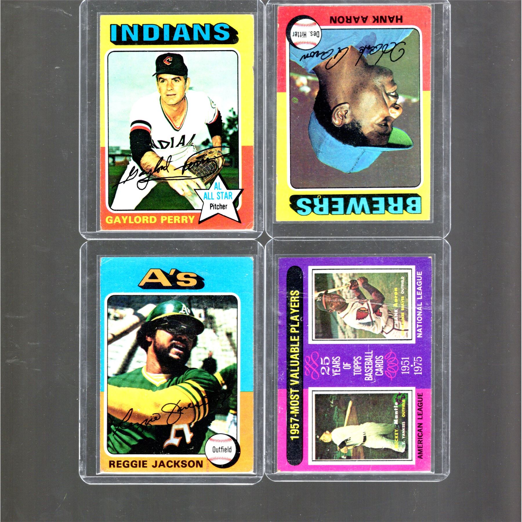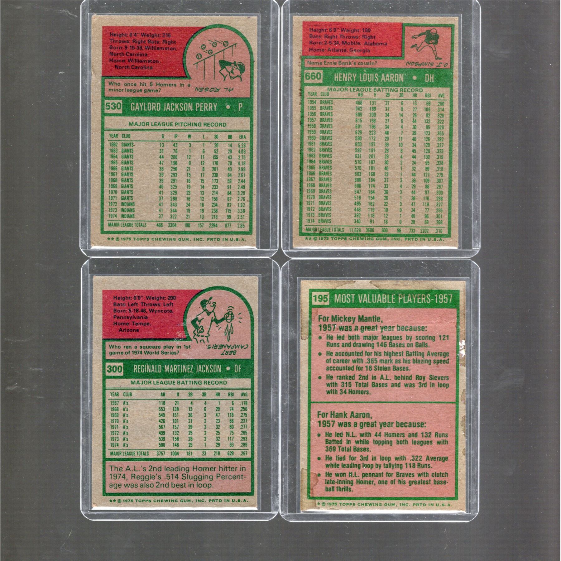 1975 Topps: Hank Aaron, Reggie Jackson, '57 MVP (glue stains on back), & Gaylord Perry