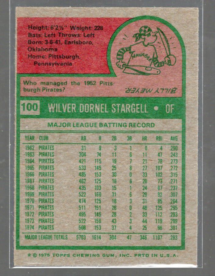 1975 Topps Willie "Pops" Stargell Card number 100 in Great Condition!!!