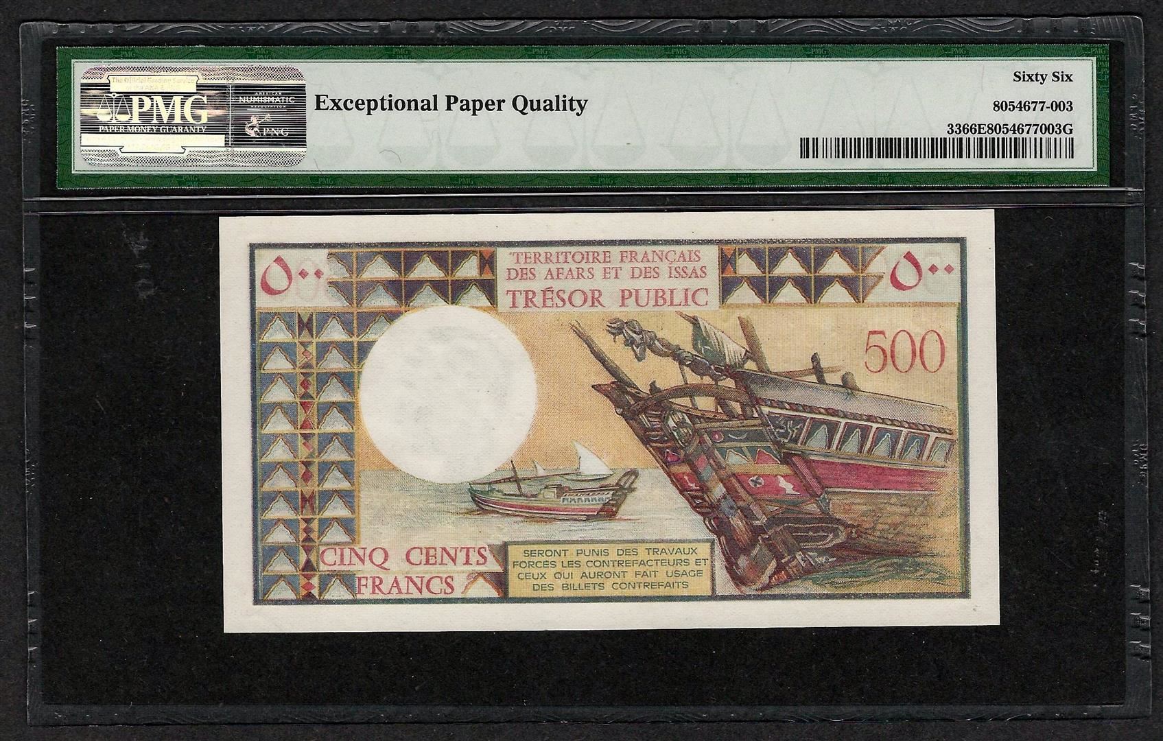 One 1975 Tresor Public French Afras & Issas 500 Francs Note PMG Gem Uncirculated 66EPQ. PMG Certified.