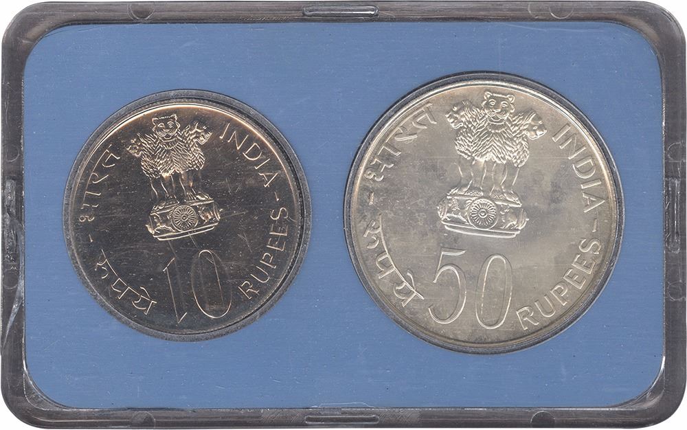 1975, UNC Set,Equality Development Peace,10 Rupees 50 Rupees, Bombay Mint, (RB # 52),intact condition of the certificate and cover with acrylic case,Rare.