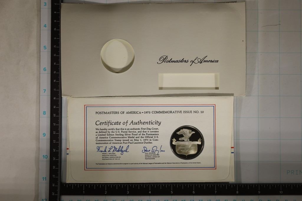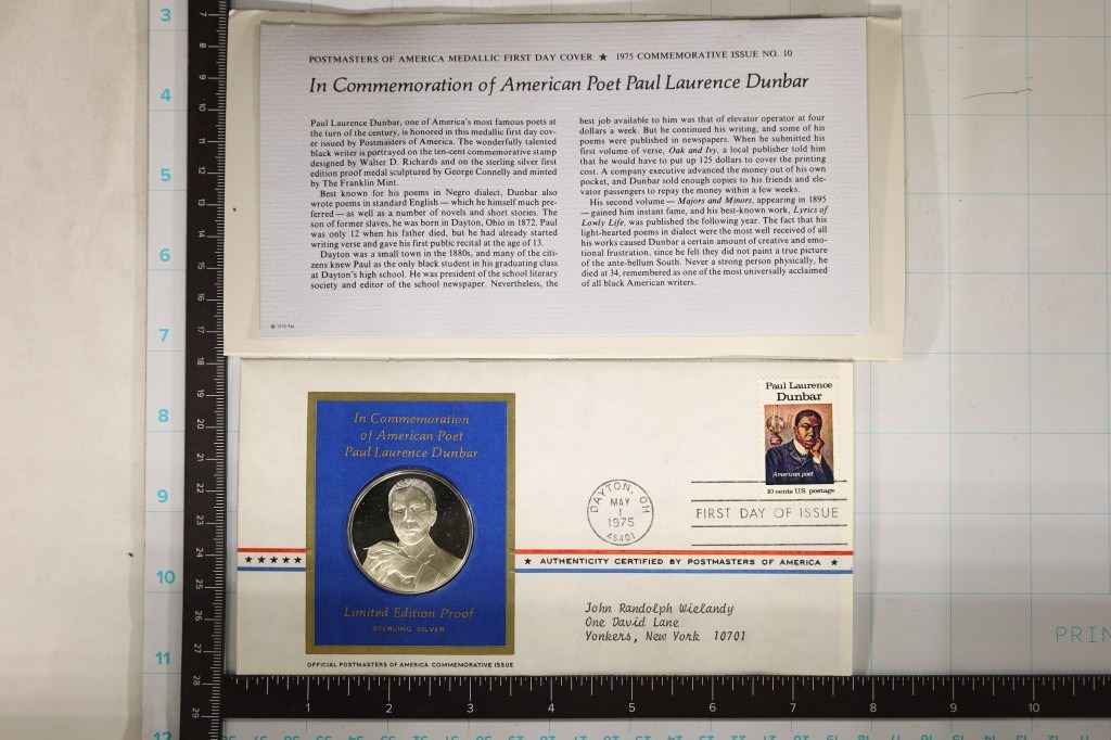 PROOF MEDALLION SEALED IN AN FDC POSTALLY CANCELLED MAY 1ST, 1975 IN COMMEMORATION OF POET PAUL LAURENCE DUNBAR FROM THE FRANKLIN MINT. HAS PAPERWORK AND OUTER ENVELOPE